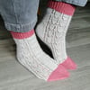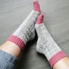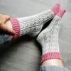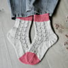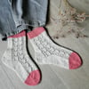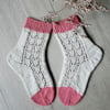 The Himalayas sock pattern features a lace panel on both sides of the sock, an interesting heel construction with gusset, and the Barn Toe. The socks are worked cuff down. A light sport weight yarn was used for the sample socks. Socks can be worked on double-pointed needles, two