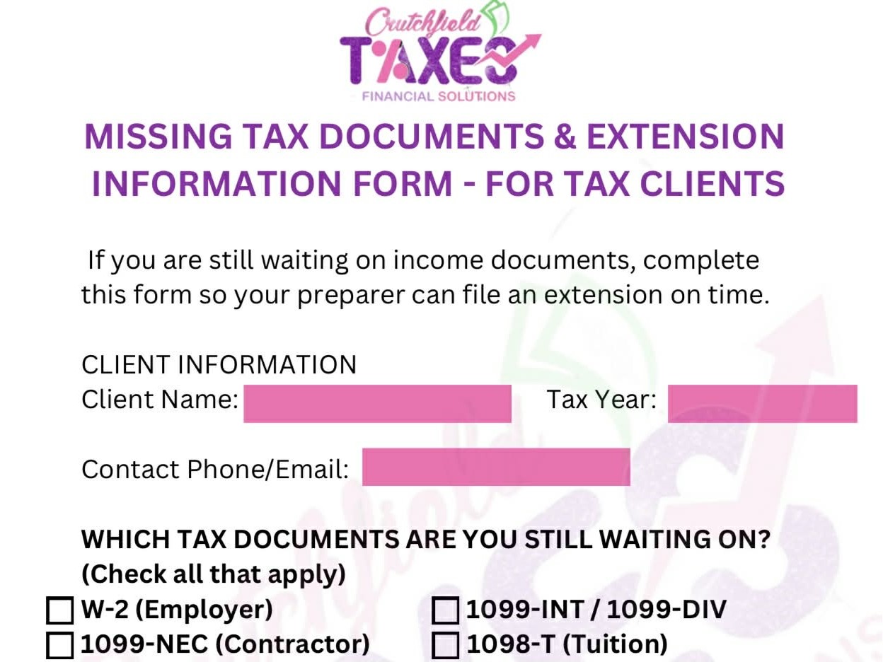 Stay organized during extension season with the Tax Extension Worksheet for the Tax Preparer and the Tax Client! 📄💼 This easy-to-use, editable worksheet helps both professionals and clients track extension details, estimate payments, and ensure nothing gets missed. Perfect for a smooth, accurate extension process!
