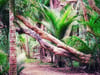 A tree fallen over a bush track surrounded by green ferns and bush on a popular nature walk in New Zealand.