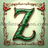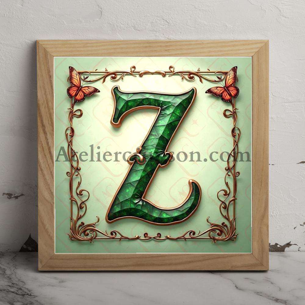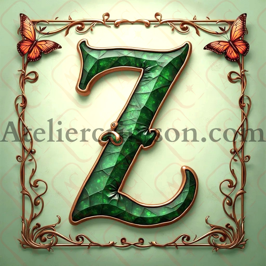 The letter Z emerald and copper Art Nouveau Intricate design with floral patterns, butterflies, and vines. Elegant sage green background. Perfect for vintage lovers and typography enthusiasts.