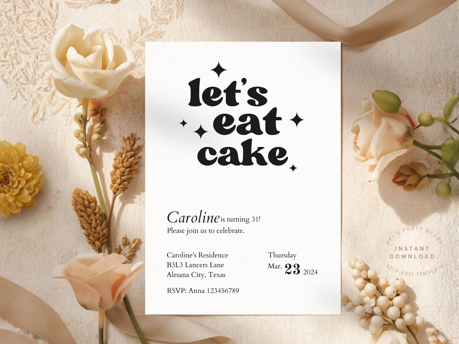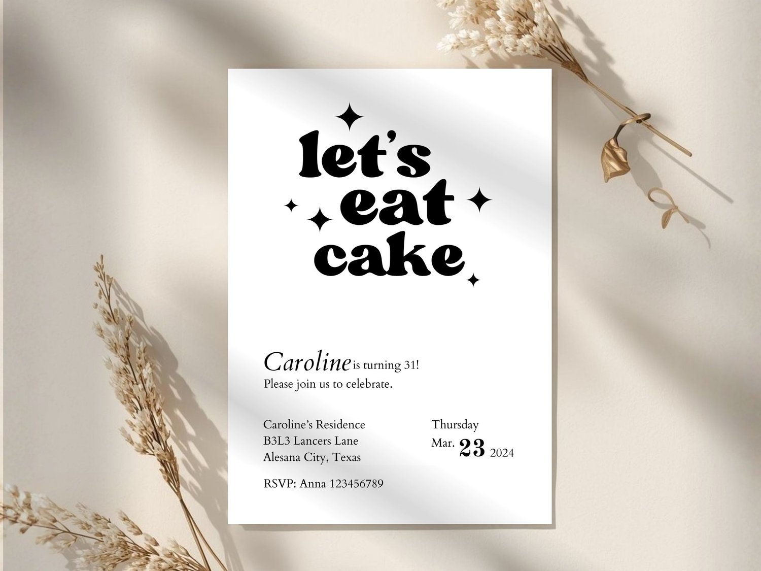 Celebrate in style with this modern “Let’s Eat Cake” birthday invitation template. Featuring a clean minimalist design with bold typography and subtle sparkles, this invitation is perfect for adult birthdays, milestone celebrations, or stylish cake parties.