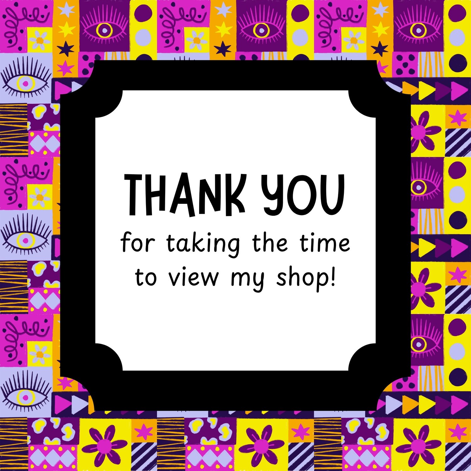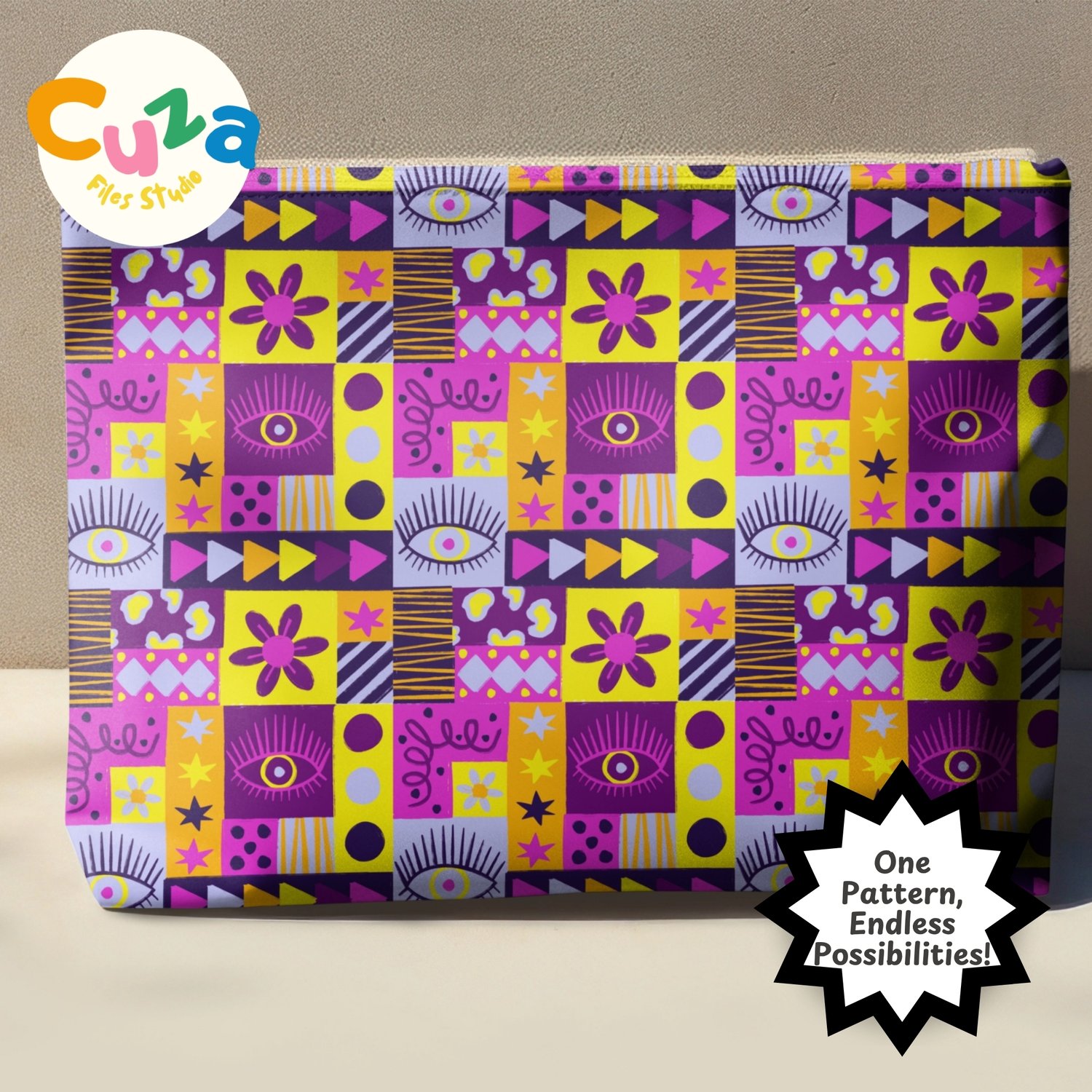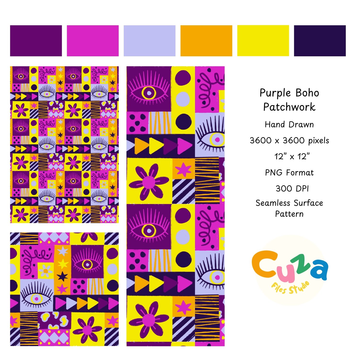 Give your projects a cool twist with this hand-drawn purple patchwork pattern! It's got a bold, geometric vibe with a fun mix of retro stuff like eyes, daisies, stars, triangles, stripes, and abstract shapes. All put together in a bright patchwork quilt style with purple, fuschia pink, yellow, and orange colors.