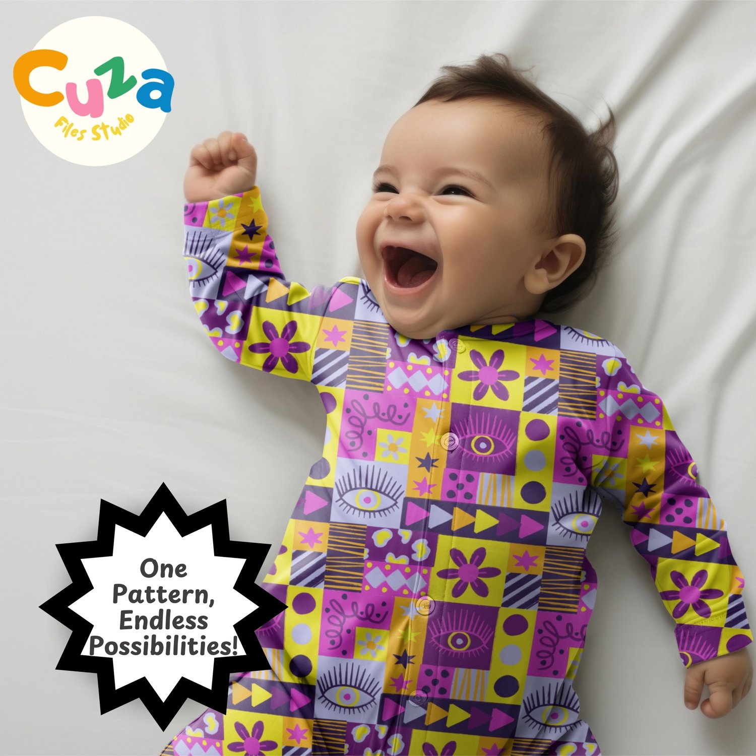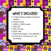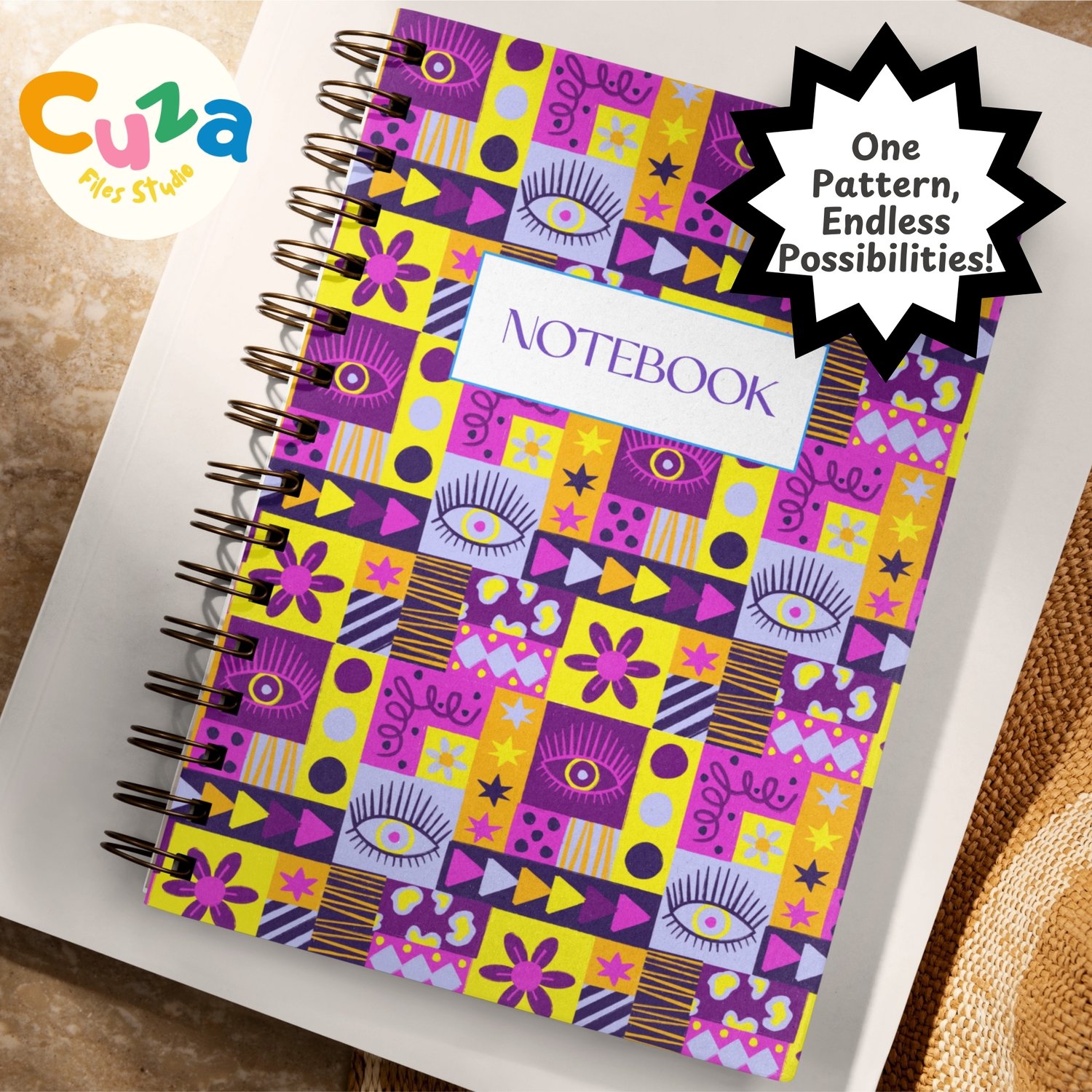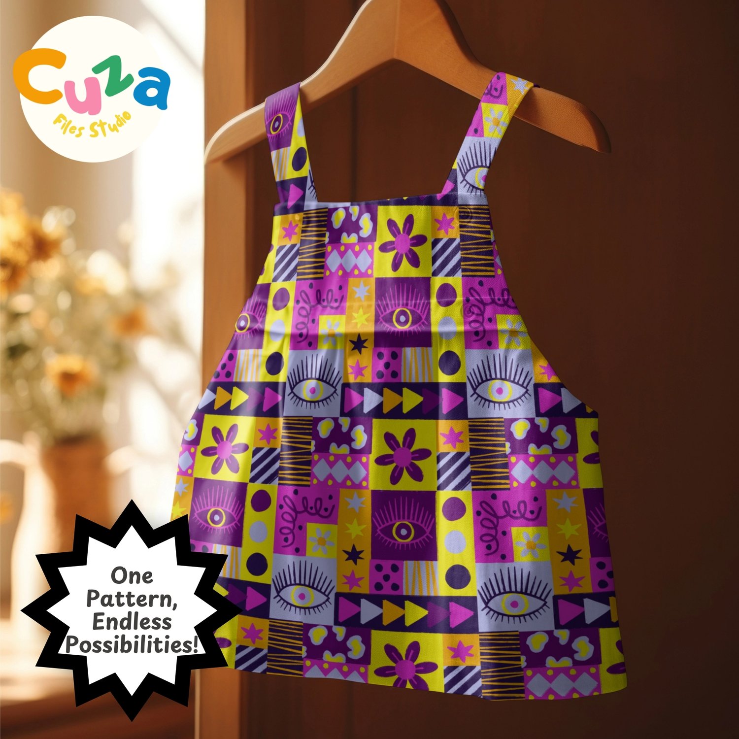 Give your projects a cool twist with this hand-drawn purple patchwork pattern! It's got a bold, geometric vibe with a fun mix of retro stuff like eyes, daisies, stars, triangles, stripes, and abstract shapes. All put together in a bright patchwork quilt style with purple, fuschia pink, yellow, and orange colors.