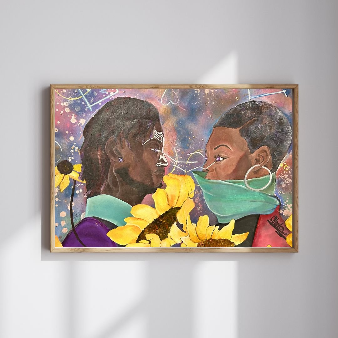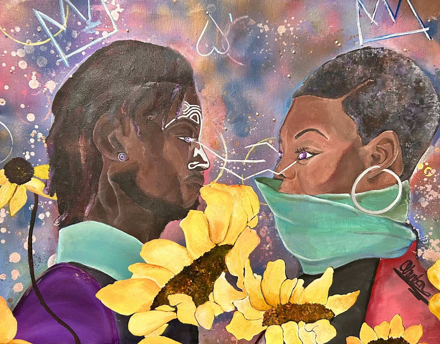 In a Sunflower Garden is a tender and vibrant celebration of love, connection, and unity. Painted in acrylic on canvas, it depicts the side profile (head and shoulders) of a Black man and woman gazing deeply into each other’s eyes, surrounded by a lush sunflower-filled setting.
