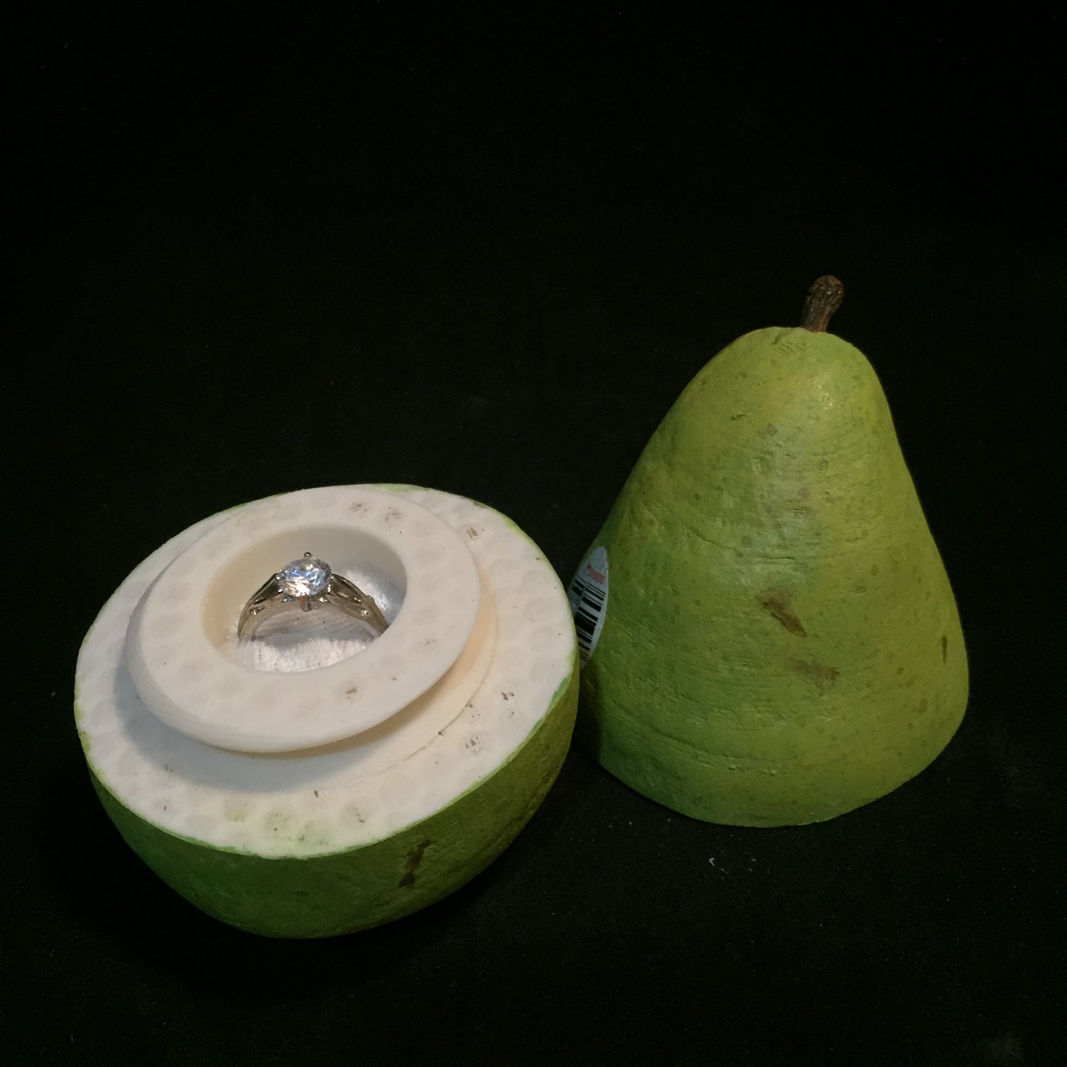 A hyper-realistic pear with a hidden screw-top base that conceals a ring holder inside — the most convincing fruit bowl proposal you'll ever pull off. Two-part file (body and screw-top base), works in FDM or resin, no supports needed. Designed by Paul Pape — 20+ years of prop fabrication experience in every file.