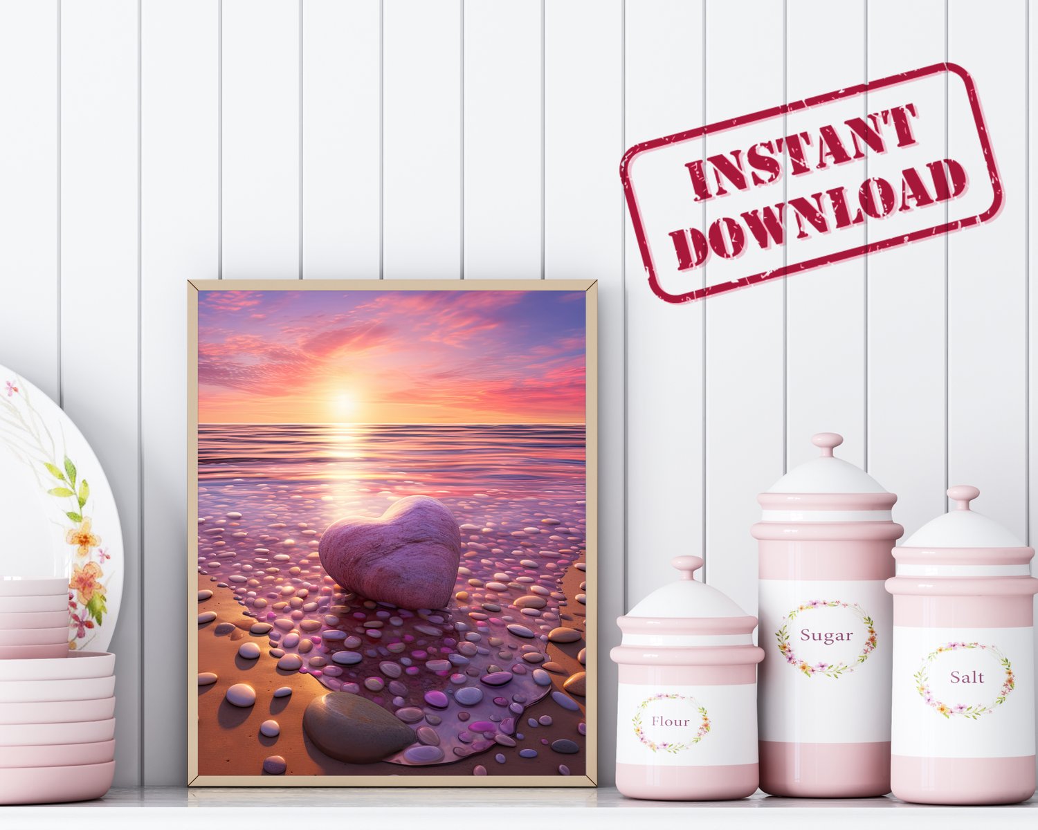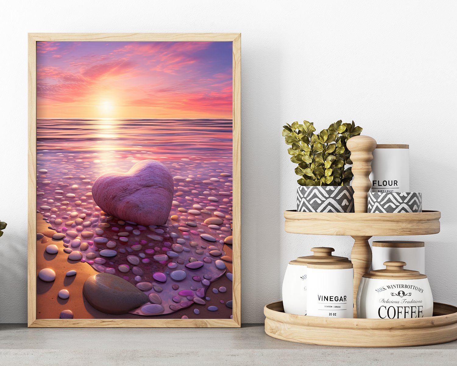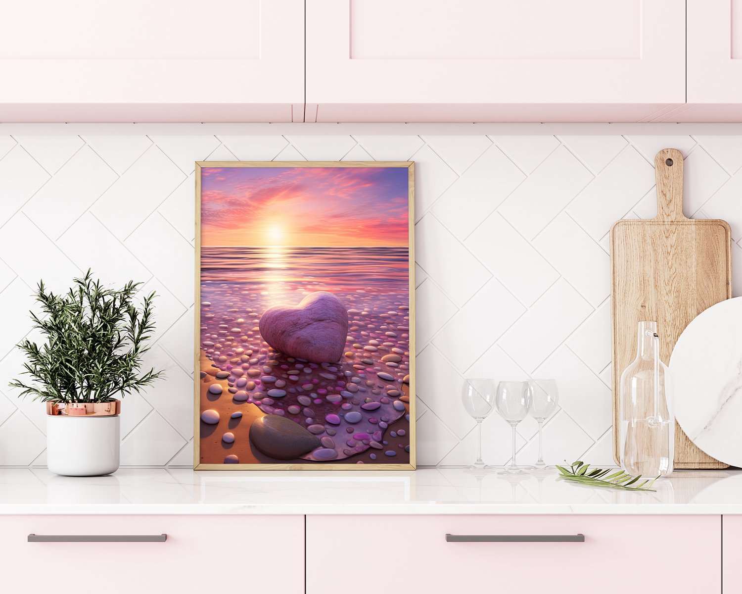 Capture the tranquillity of a relaxing day by the sea with my stunning Serene Sunset Seascape Wall Art. This beautiful artwork depicts a serene scene of a sun setting over the tranquil waters, filling the sky with captivating hues of pink and purple. Adding a touch of elegance, a heart-shaped pebble rests gently on the sandy shore, symbolizing love and serenity.