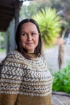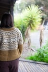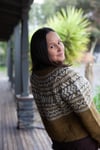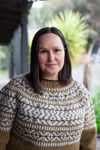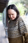 The colourwork patterns in the yoke are based on traditional decorative patterns used in Handwoven Saami belts and bands.