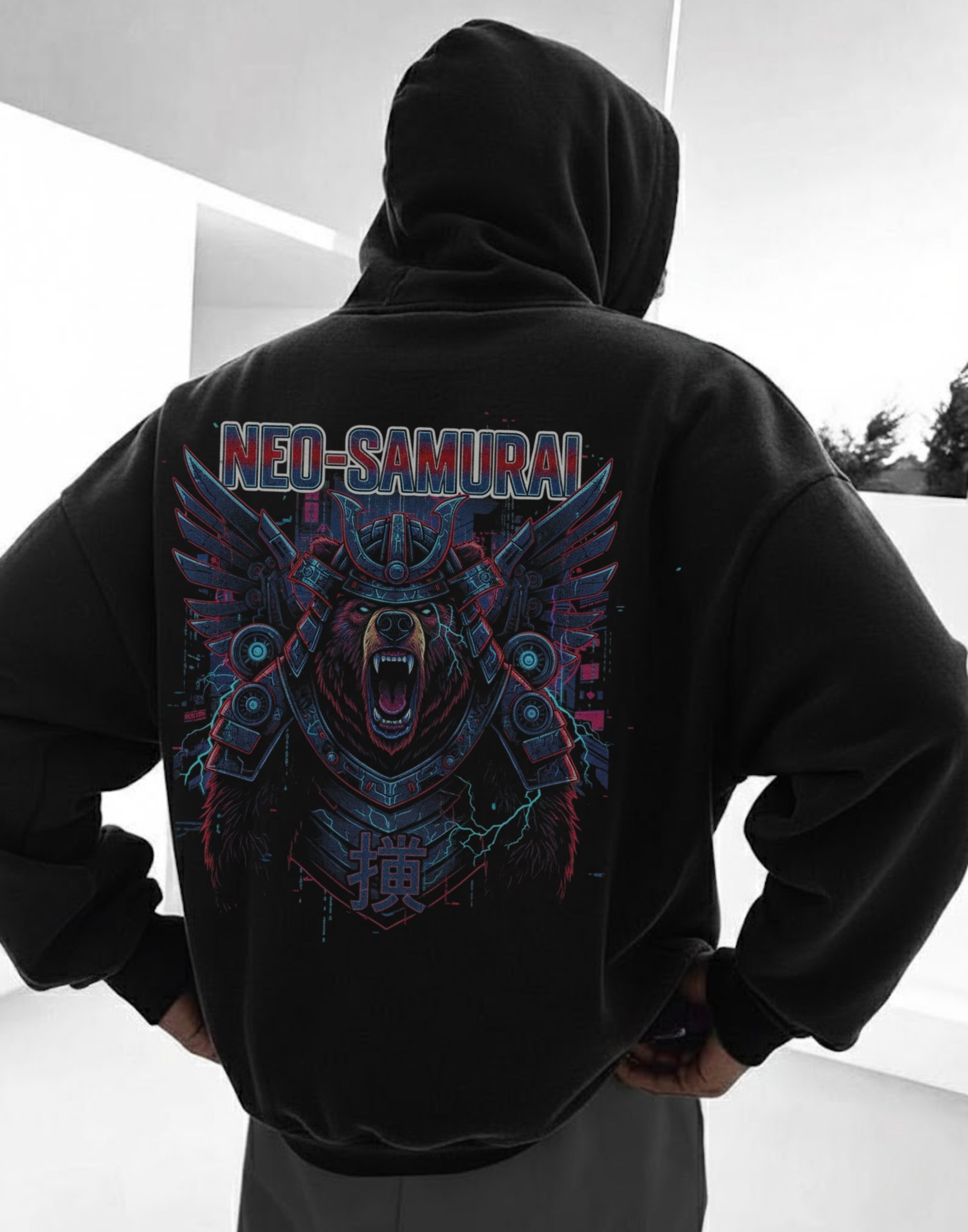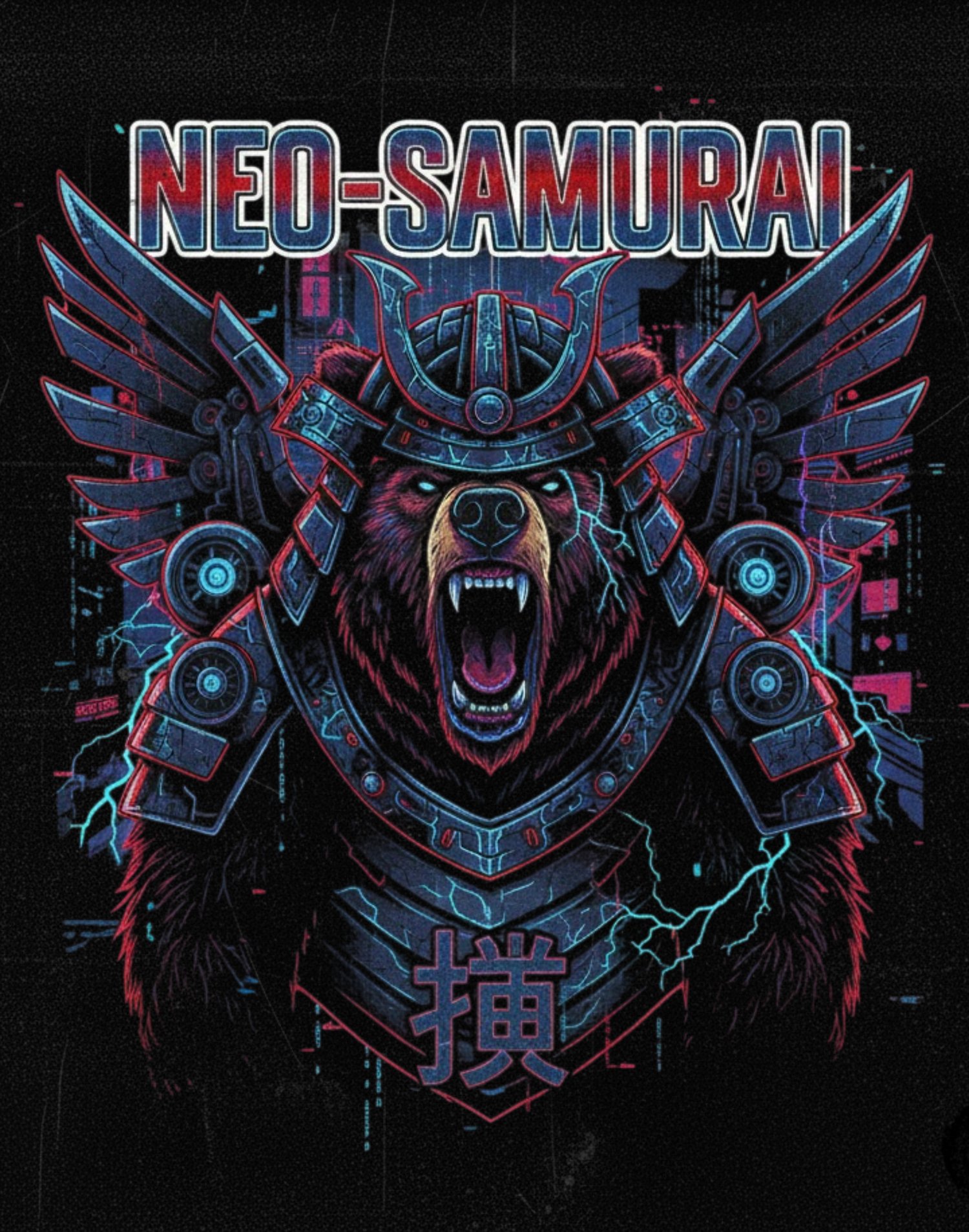 NEO SAMURAI is a futuristic streetwear graphic blending traditional samurai symbolism with a modern, cyber-influenced aesthetic.
