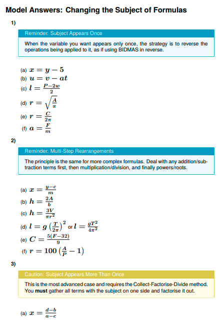 IGCSE Extended Level Maths: Changing the subject of a formula (Worksheet & Model Answers)