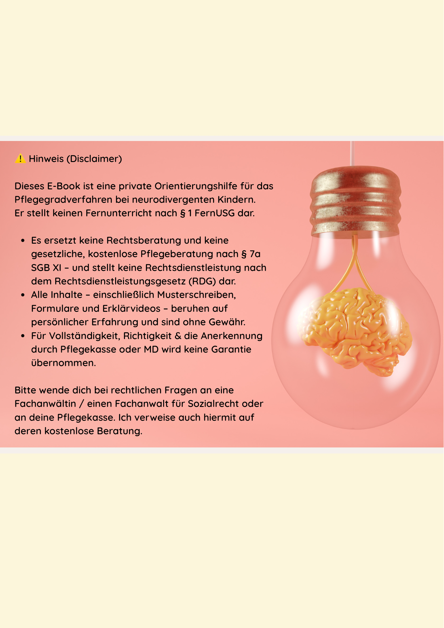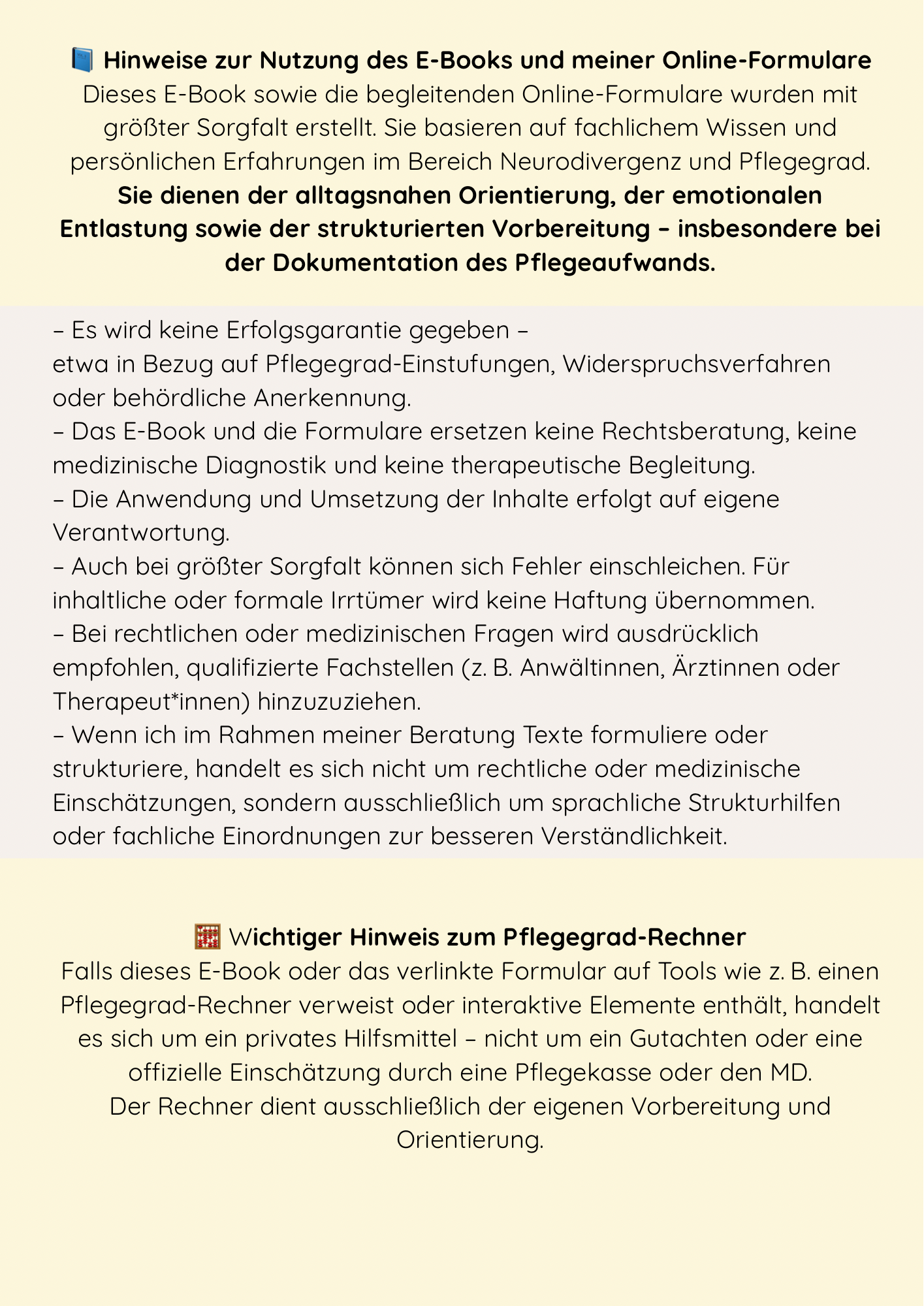 Alle Inhalte dienen der allgemeinen Orientierung und als praktische Hilfe zur eigenen Dokumentation. Trotz sorgfältiger Erstellung ßbernehme ich keine Haftung fßr Vollständigkeit, Aktualität, individuelle Anwendbarkeit oder mÜgliche Fehler im eBook, im Toolkit oder in den Vorlagen. Gesetzliche Grundlagen, Richtlinien und Begutachtungspraxis kÜnnen sich ändern und mßssen im Einzelfall eigenverantwortlich geprßft werden.