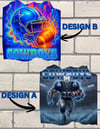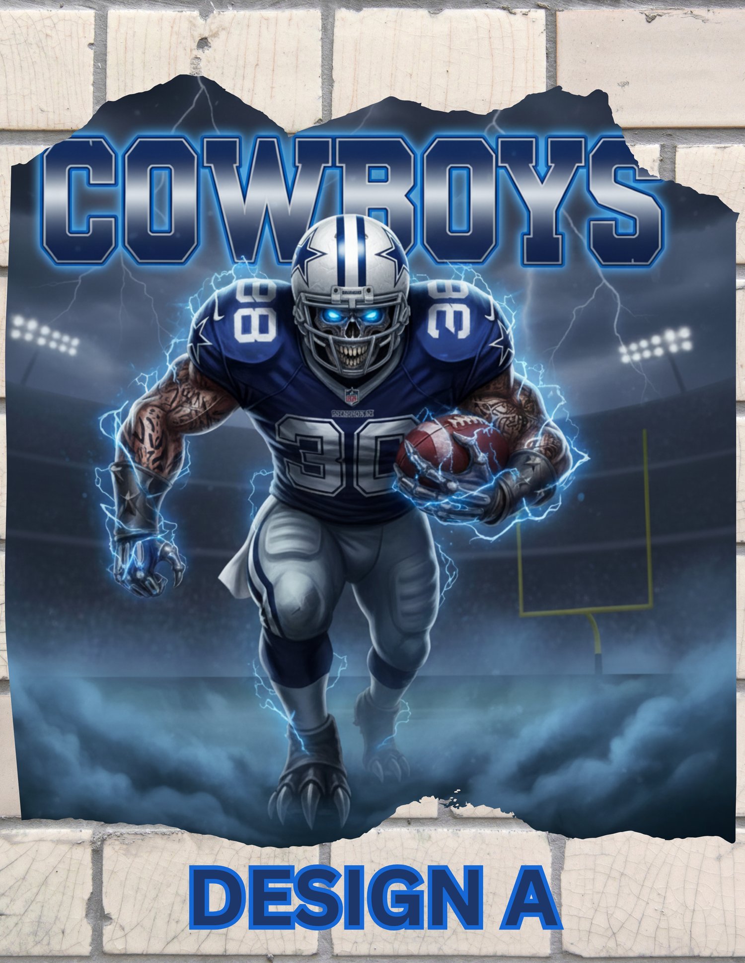 Design A (Electric Power) is a darker, more aggressive depiction, featuring a monstrous Cowboys running back surrounded by crackling blue lightning. With a skull-like face and glowing eyes, the player embodies raw, superhuman force charging out of a shadowy stadium, perfect for fans who prefer a gritty, electrifying aesthetic.