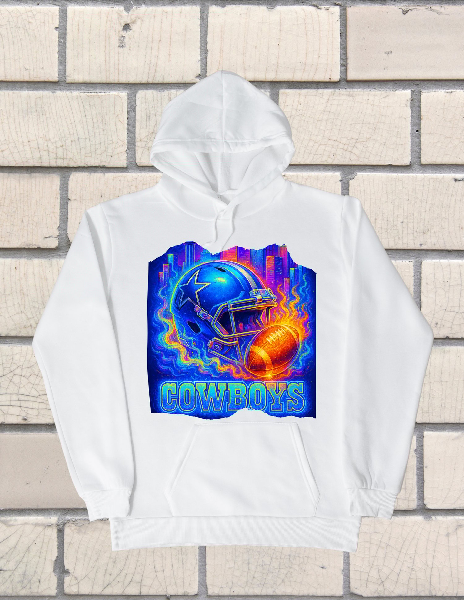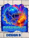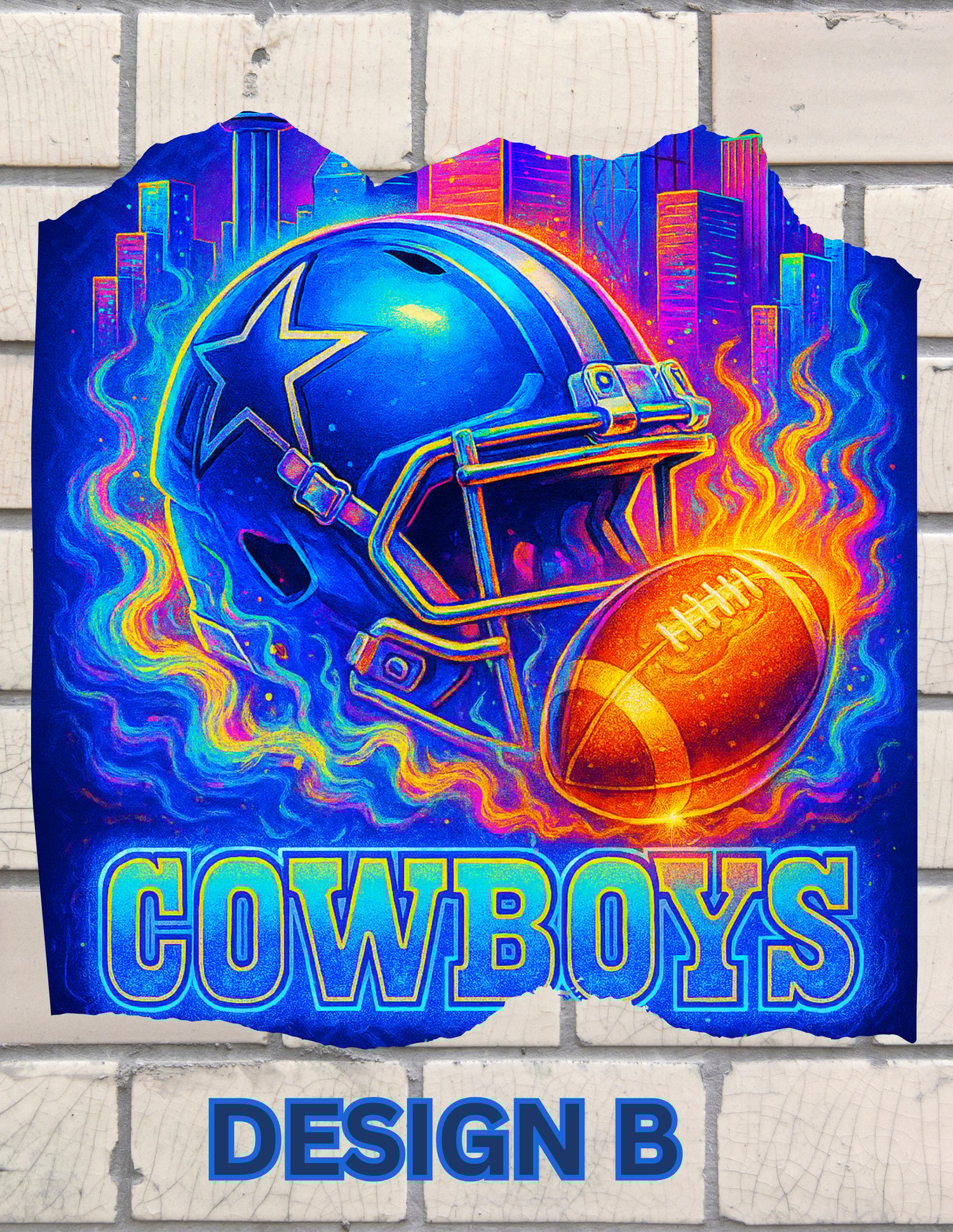 Design B (Neon Flare) is a vibrant, psychedelic take dominated by a neon-drenched Cowboys helmet and an intensely glowing football set against a brilliant cityscape. Swirling with hues of electric blue, fiery orange, and magenta, this design has a modern, energetic feel, appealing to fans who love a high-contrast, supernatural glow.