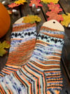 Size small (medium, large) with a cast on of 64 (68, 72) stitches and a finished circumference of 7 (7.5, 8)” (18 (19, 20) cm). The foot can be knit to any length. The socks are intended to be worn with 0.5-1” (1-3 cm) negative ease for the best fit, but please keep in mind that the stranded bat section has less stretch than the rest of the socks.