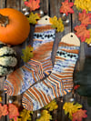 The Totally Batty socks are the best Halloween accessory! Knit from the cuff down, the Totally Batty socks feature a colony of swooping bats knit in stranded colourwork (with eyes duplicate stitched on when the knitting is done). One sock is striped according to the latest witchy trends and the other is knit in the main colour for a perfectly mismatched pair. Of course, if you’re not a fan of fraternal socks you can also go for two striping socks or two solid socks. Or go totally batty and add more bats!