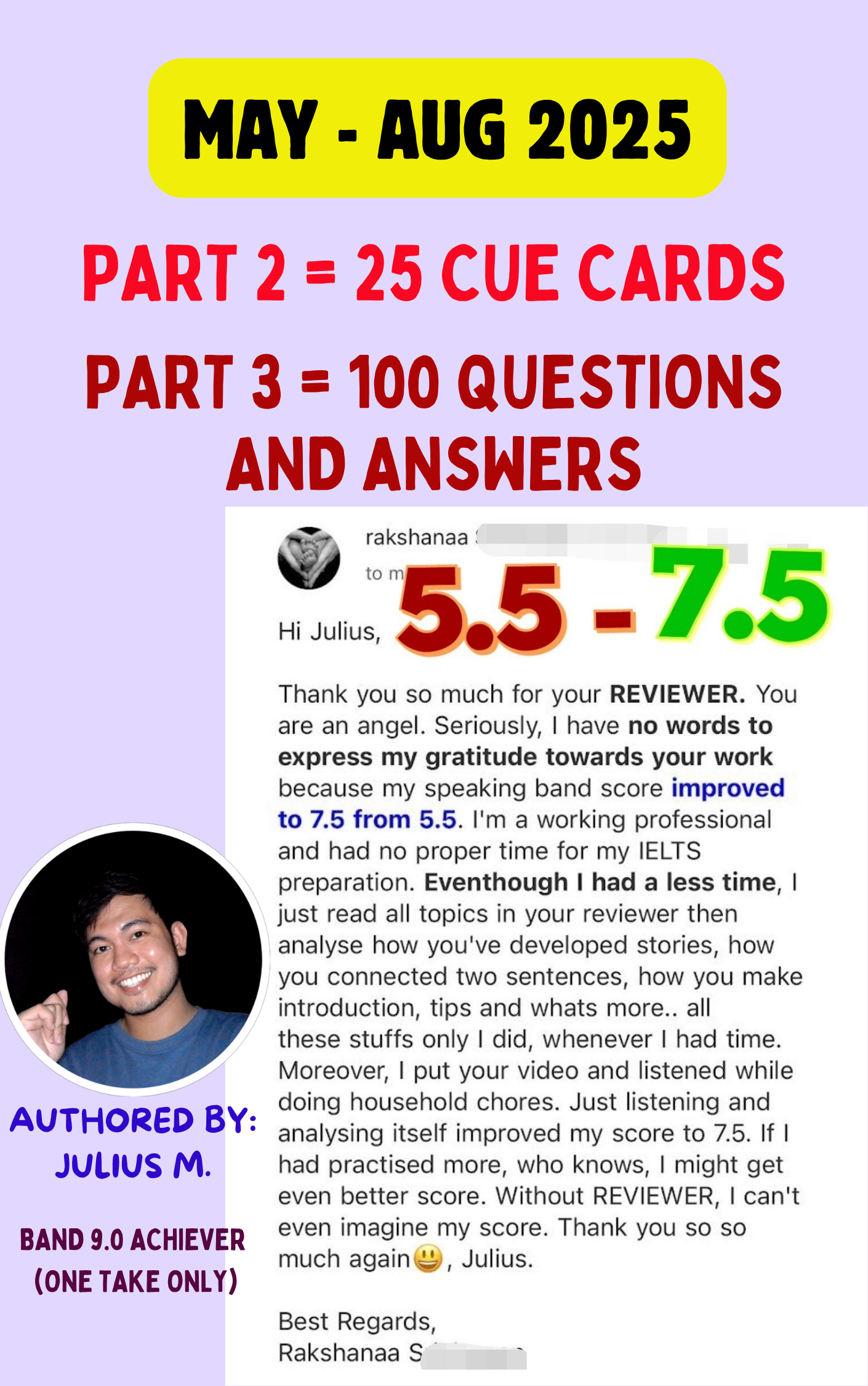 This reviewer answers the latest Cue Cards and PART 3 Practice Questions for MAY - AUGUST 2025.