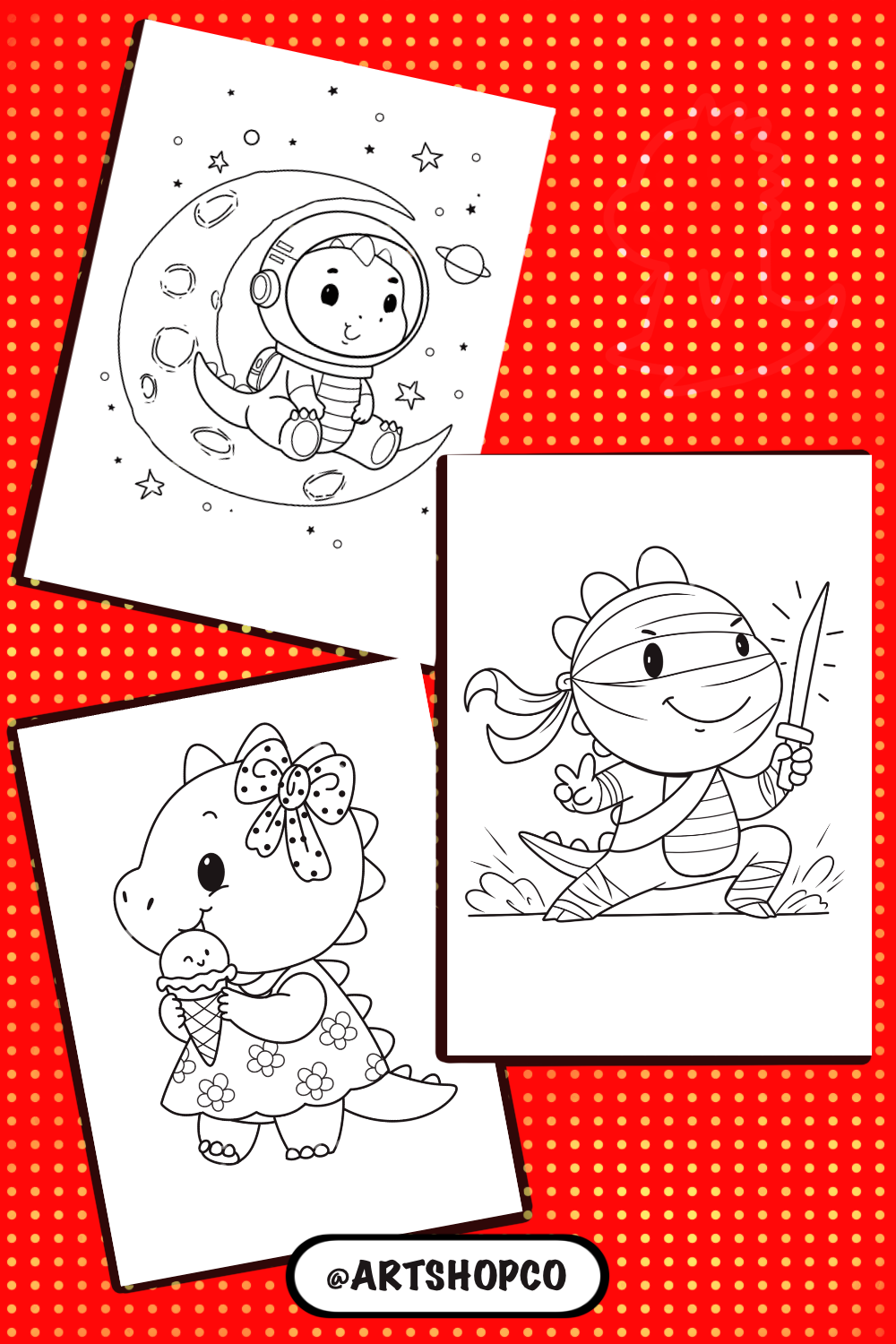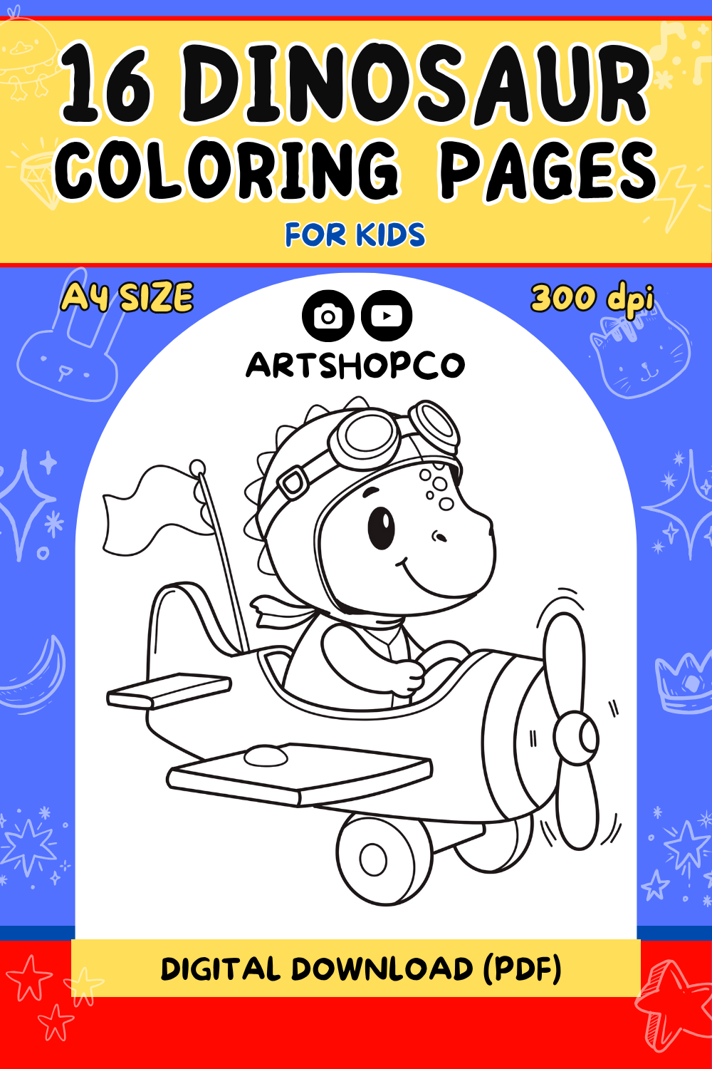 Download the 16-page cute dinosaur coloring pack! Printable PDF coloring book and illustration worksheet for kids aged 3-8. One-time download for personal use only.