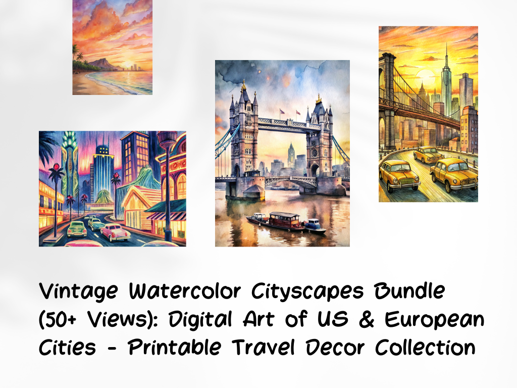 Vintage Watercolor Cityscapes Bundle (50+ Views): Digital Art of US & European Cities - Printable Travel Decor Collection