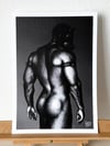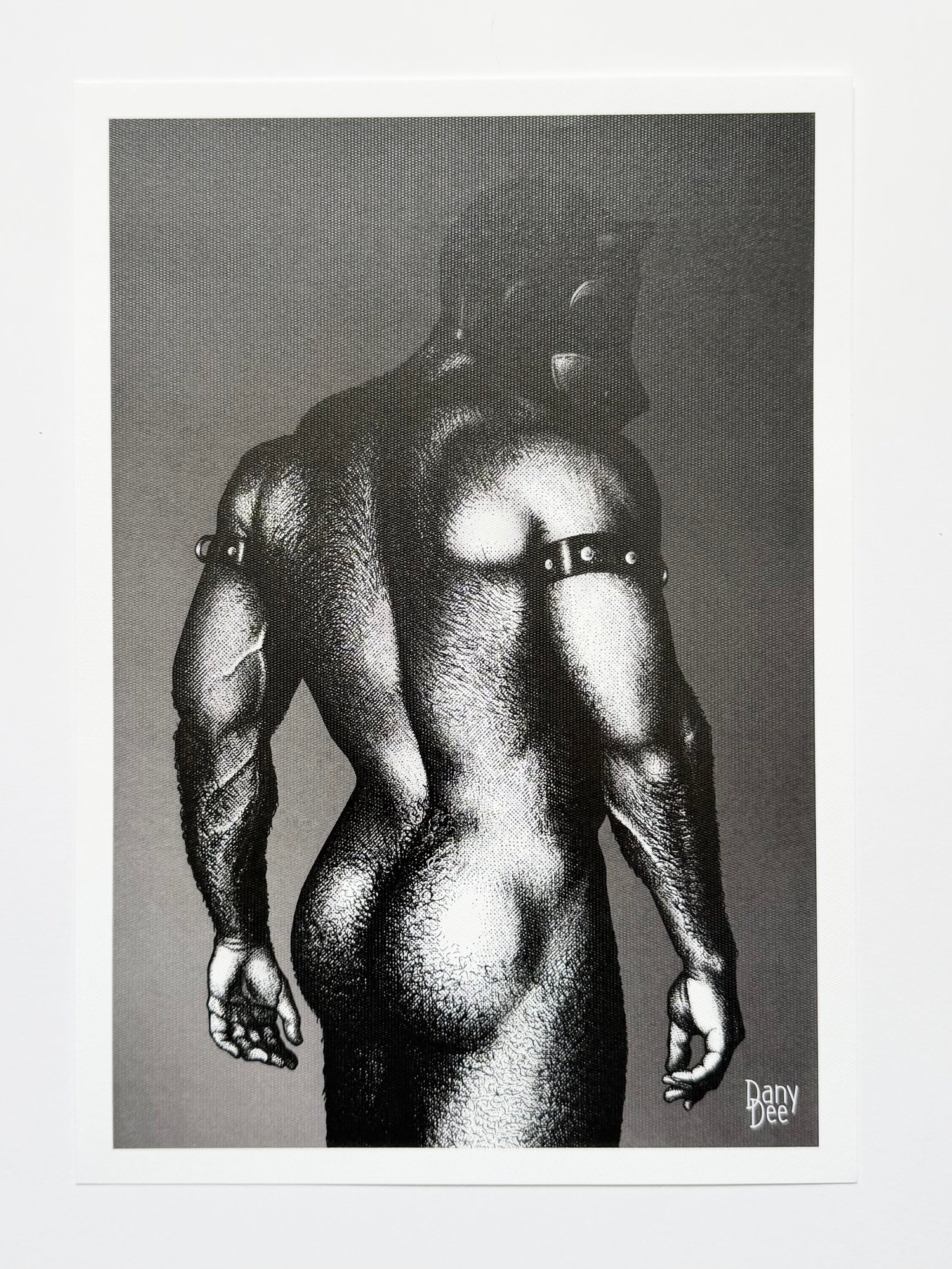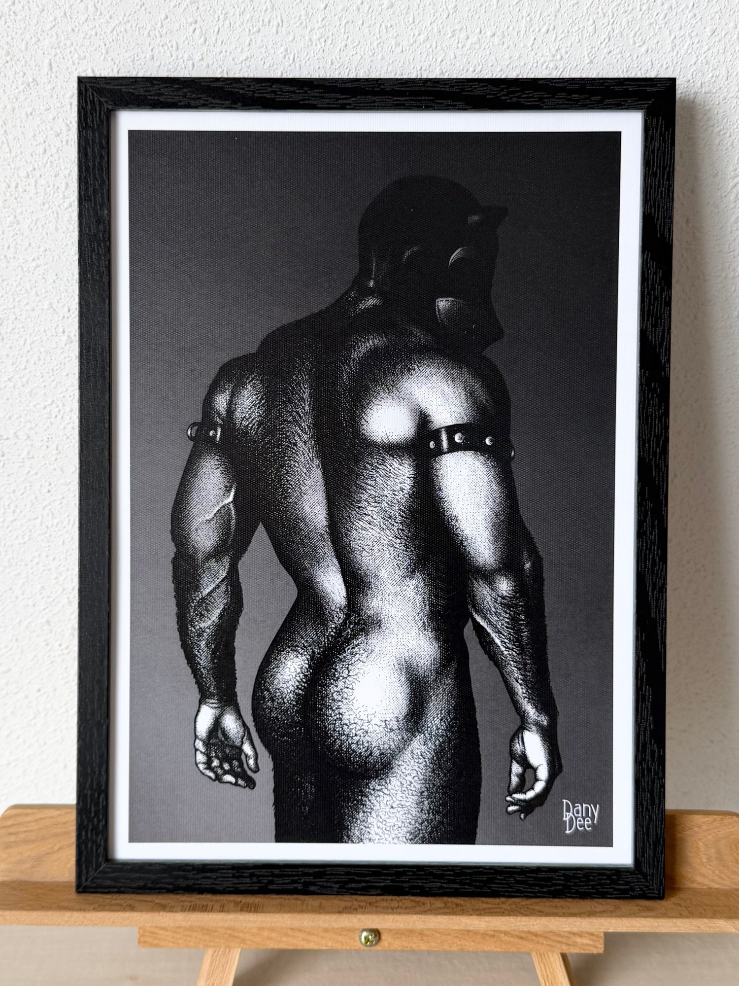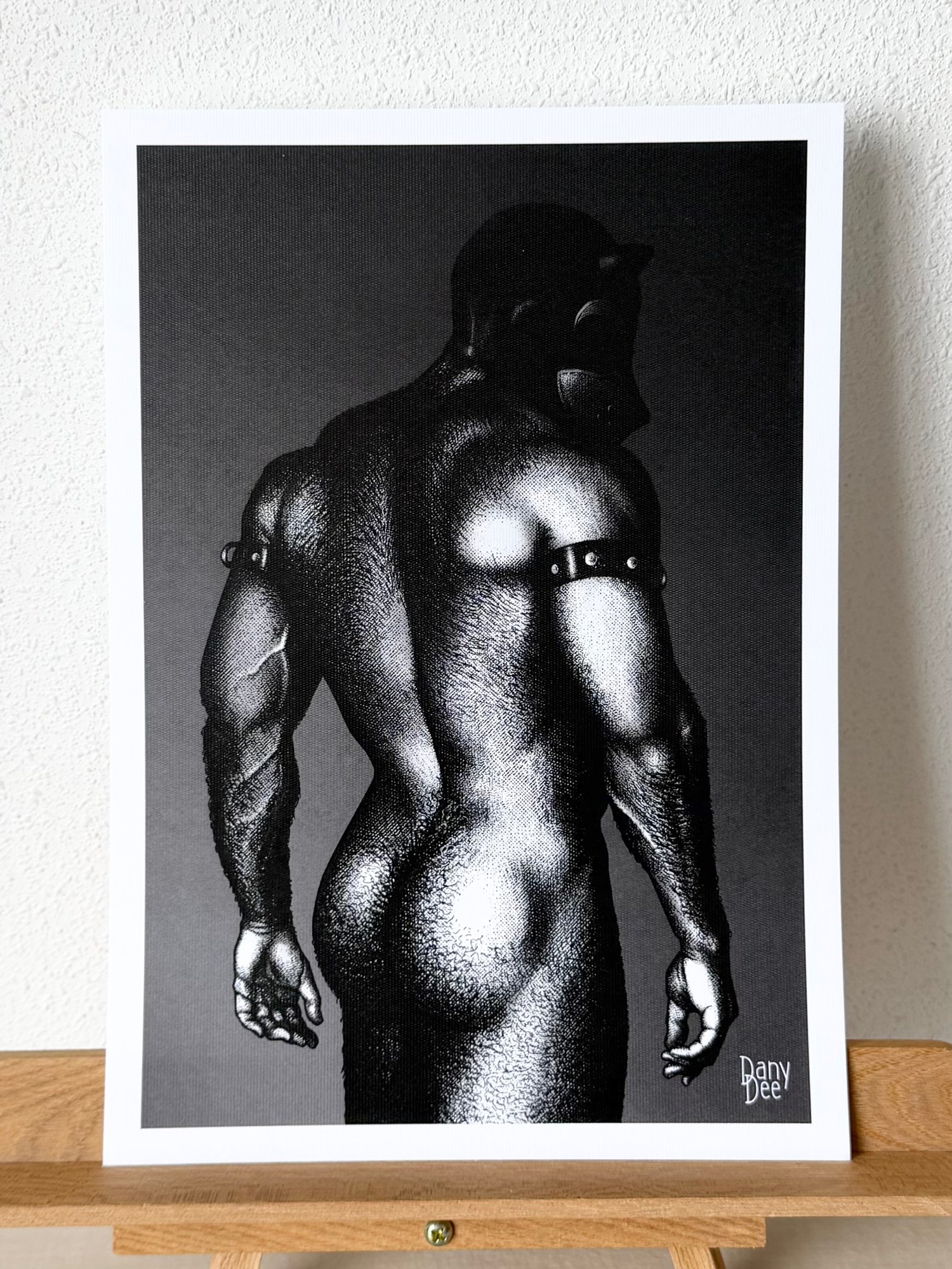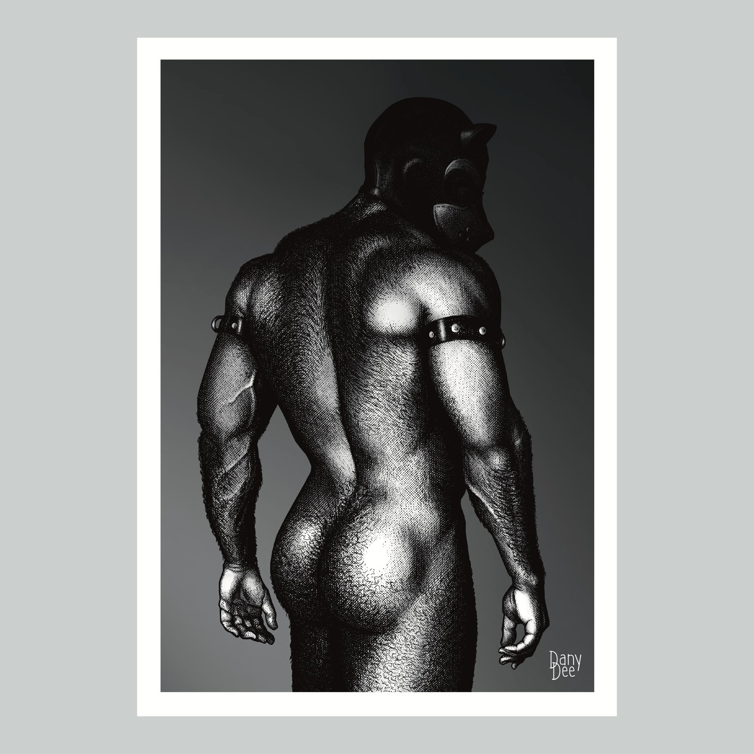 "The Bear No. 2" is a hand-drawn, monochromatic A4 art print celebrating gay bear leather culture — a bold homoerotic illustration of a massive, hairy man seen from behind in leather cuffs and a bear mask, perfect for gay bear art collectors or queer home decor.