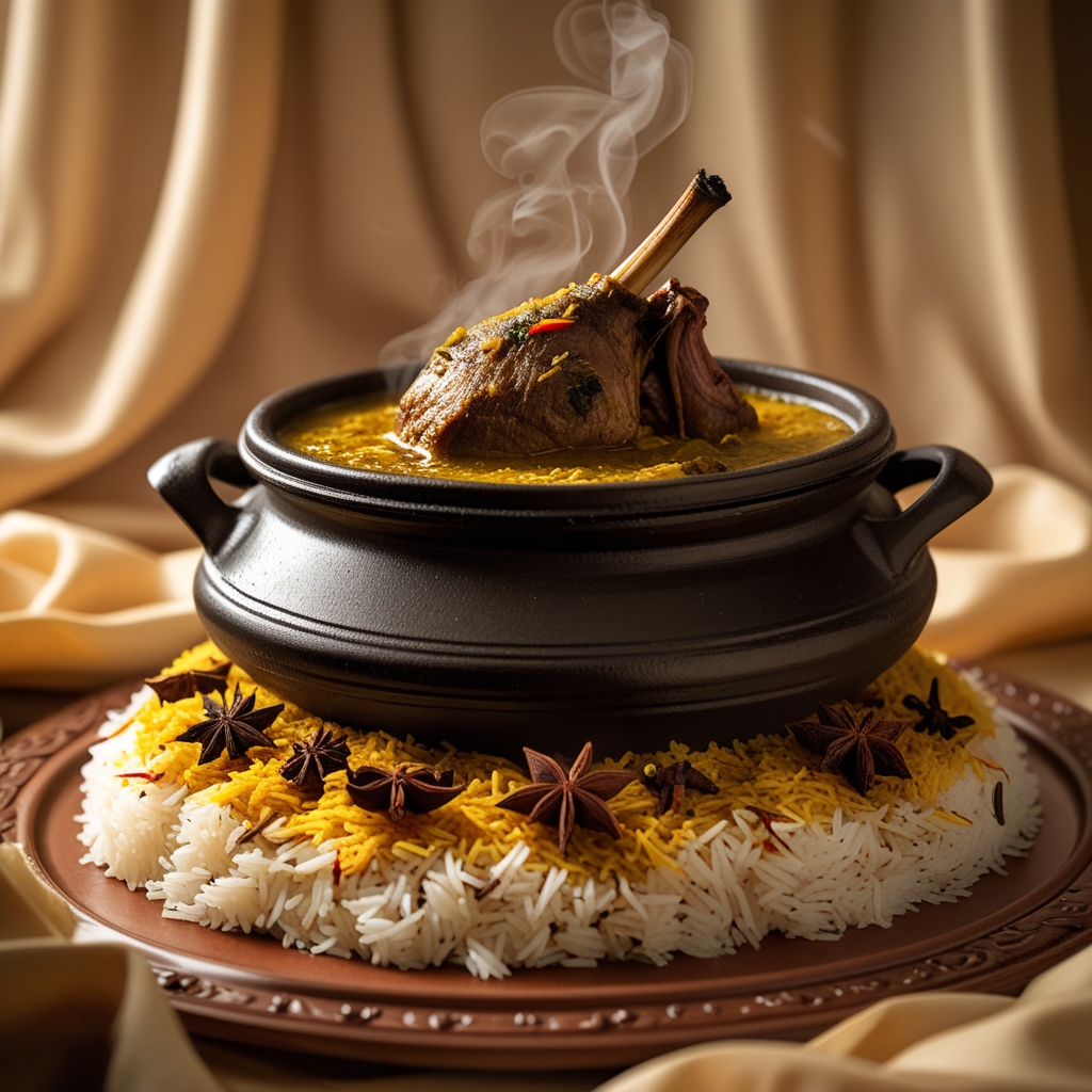 A warm and inviting professional food photography setup featuring Dum Pukht, a slow-cooked lamb dish, presented in a sealed earthen pot, placed atop a bed of aromatic saffron-infused rice, garnished with whole cardamom, star anise, and cloves, against a soft, creamy background that evokes a sense of comfort and luxury, with a hint of warm steam rising from the dish, bathed in warm, golden indoor light, emphasizing the rich flavors and aromas of the traditional Indian cuisine, with a shallow depth of field, blurring the surrounding elements, and drawing the viewer's attention to the tender, slow-cooked lamb, and the delicate arrangement of spices on the rice.