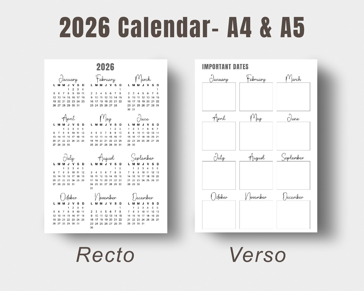 2026 Printable Calendar – Minimalist Design & Space for Important Dates (A4 & A5)