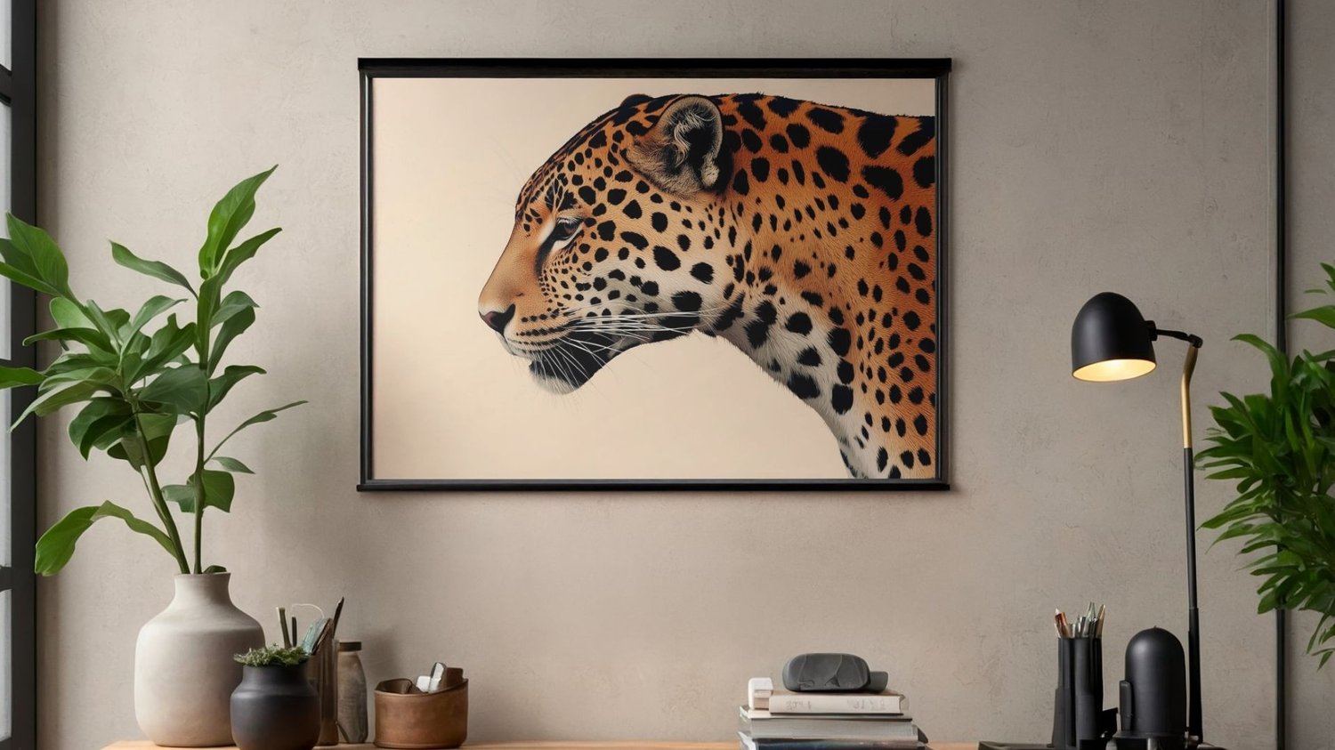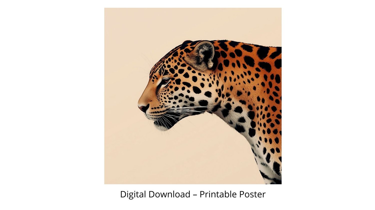 Sleek jaguar wall art printable in rich natural tones. Stylish minimalist safari decor.