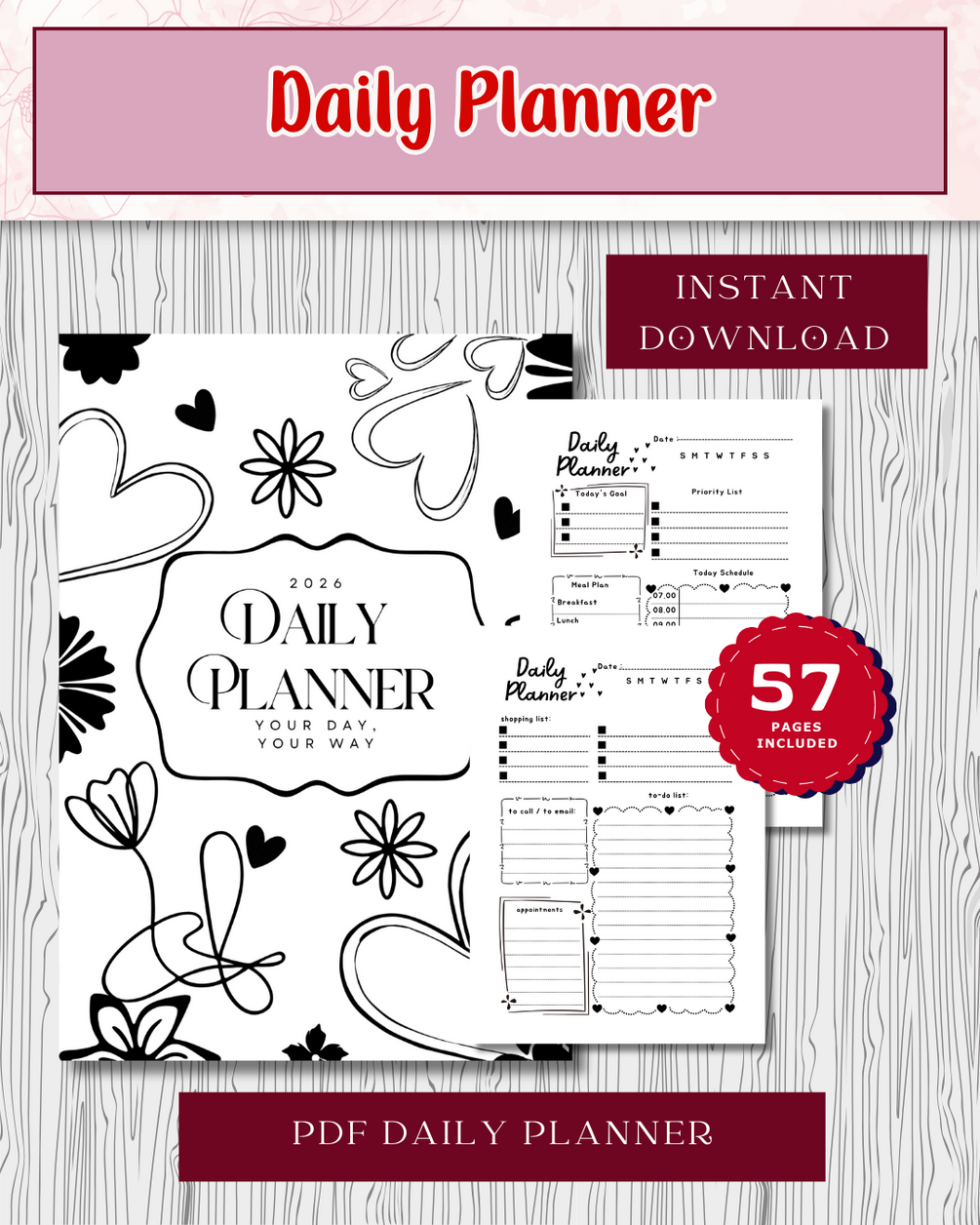 Start your year with clarity and confidence using this beautifully designed 2026 Daily Planner PDF. With 57 printable pages, this planner helps you stay focused, organized, and productive every single day.