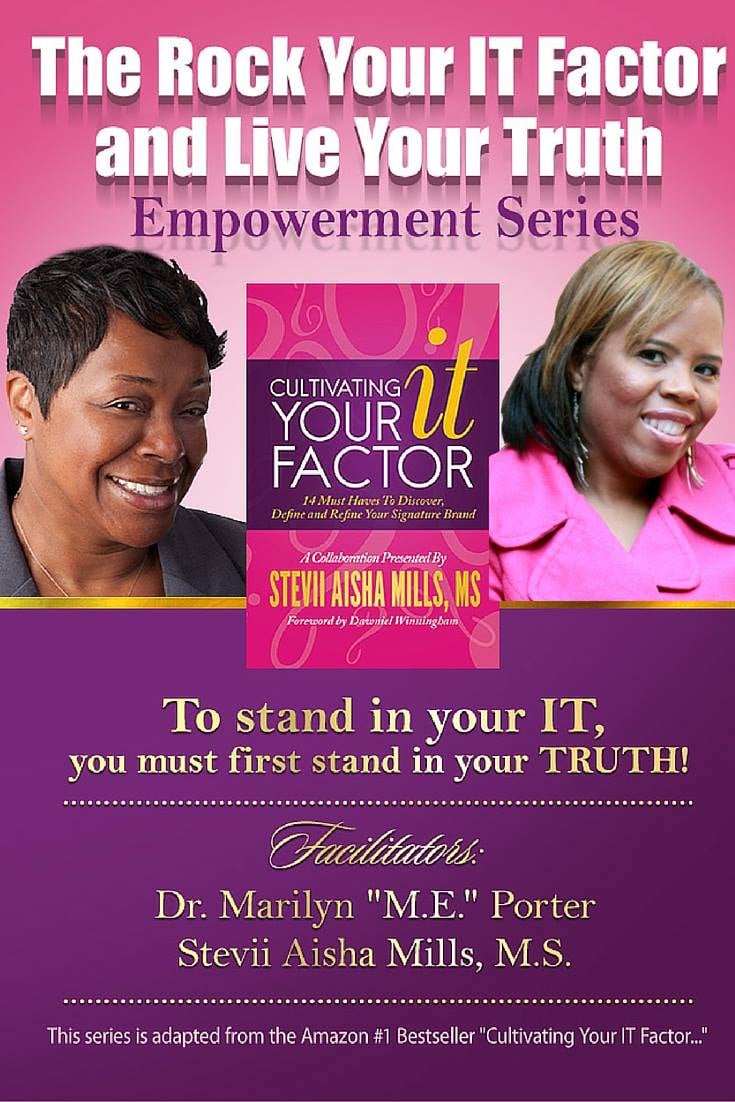 After hearing the feedback of the readers we realized that the book was not enough, there needed to be a more up close and personal forum in which we – Stevii Aisha Mills and M.E. Porter – would be able to further assist other powerful women to discover, define, refine and operate in their IT factors. Combined we occupy quite a space in the world and we know how to ROCK our IT!