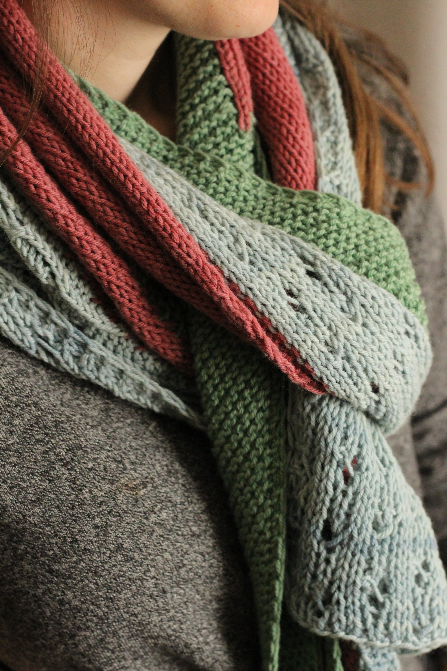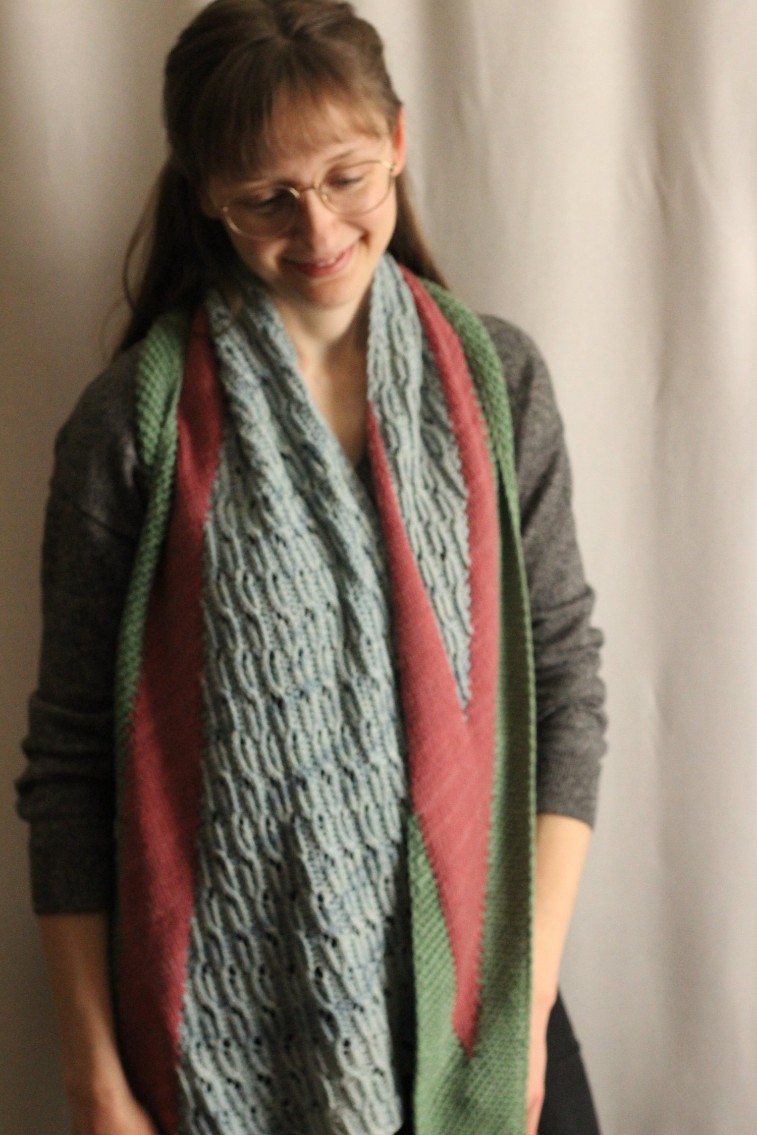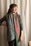 The Vána Wrap is inspired by the eponymous character from Tolkien’s The Silmarillion, in which it is said of her, “All flowers spring as she passes and open if she glances upon them; and all birds sing at her coming.” Somewhat of a hybrid between a shawl and a scarf, the wrap starts from just three stitches and gradually widens by increasing twice as fast as decreasing. As it widens, second and third colors are brought in using intarsia to create V-shaped sections of color that turn into three long stripes as they travel along the edge. The twisted-stitch lace pattern that forms the largest block of color is engaging to knit while being easy to memorize. The intarsia, varying stitch patterns, and short rows lengths all combine to make this a fast and enjoyable project. It is also easily customizable, making it a great stash-busting project.