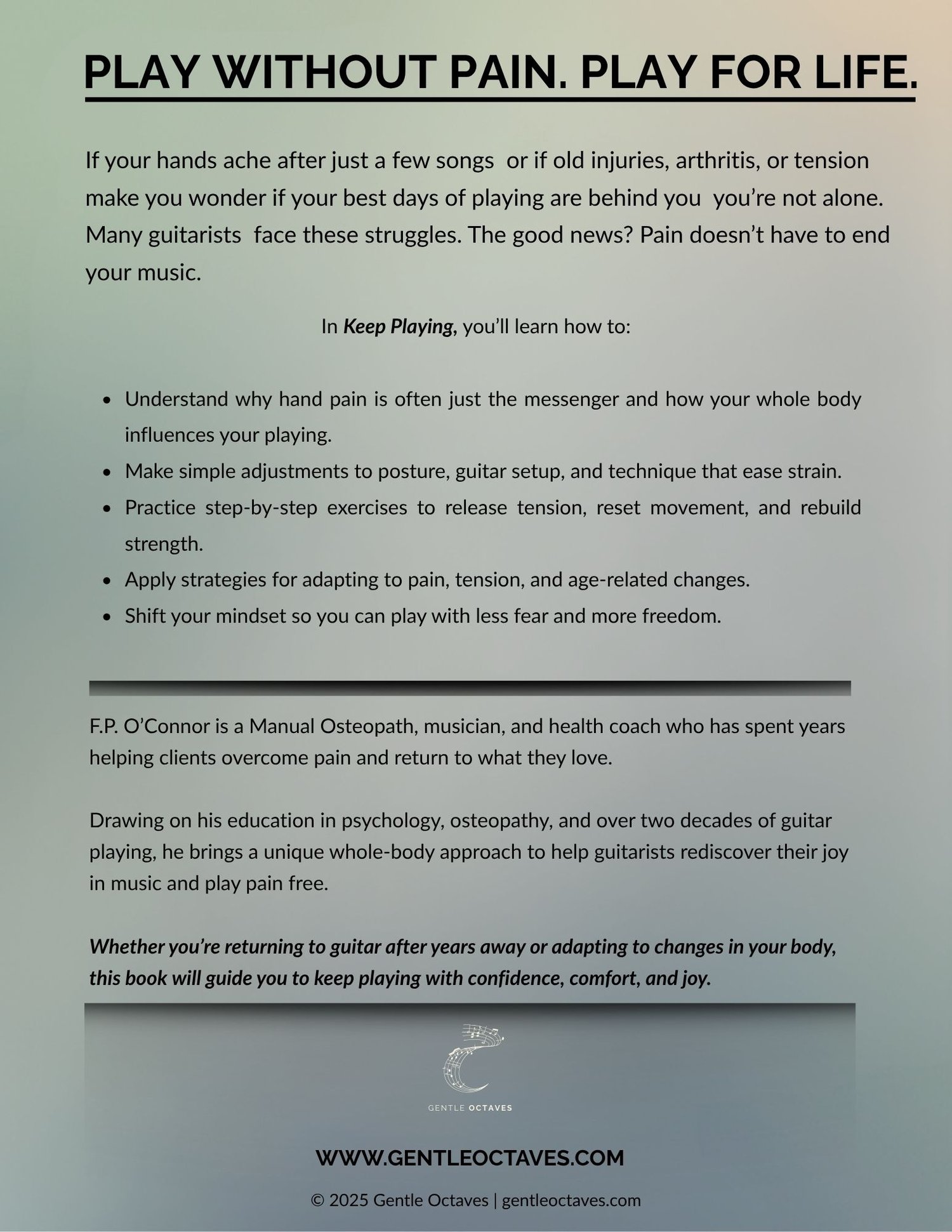 This book changes that. Keep Playing is your 219-page guide to finally understanding why your hands hurt, where the tension is coming from, and how to get back to the music without fear, strain, or second-guessing.