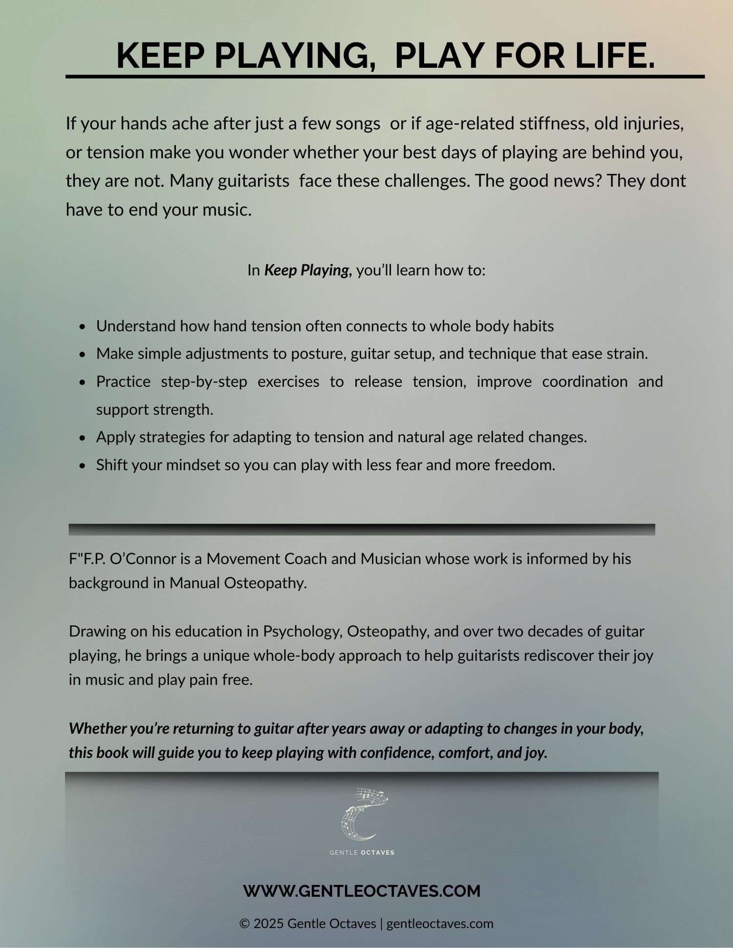 This book changes that. Keep Playing is your 219-page guide to finally understanding how movement patterns contribute to tension, where stiffness originates, and how to adapt your playing for comfort and confidence without fear, strain, or second-guessing.
