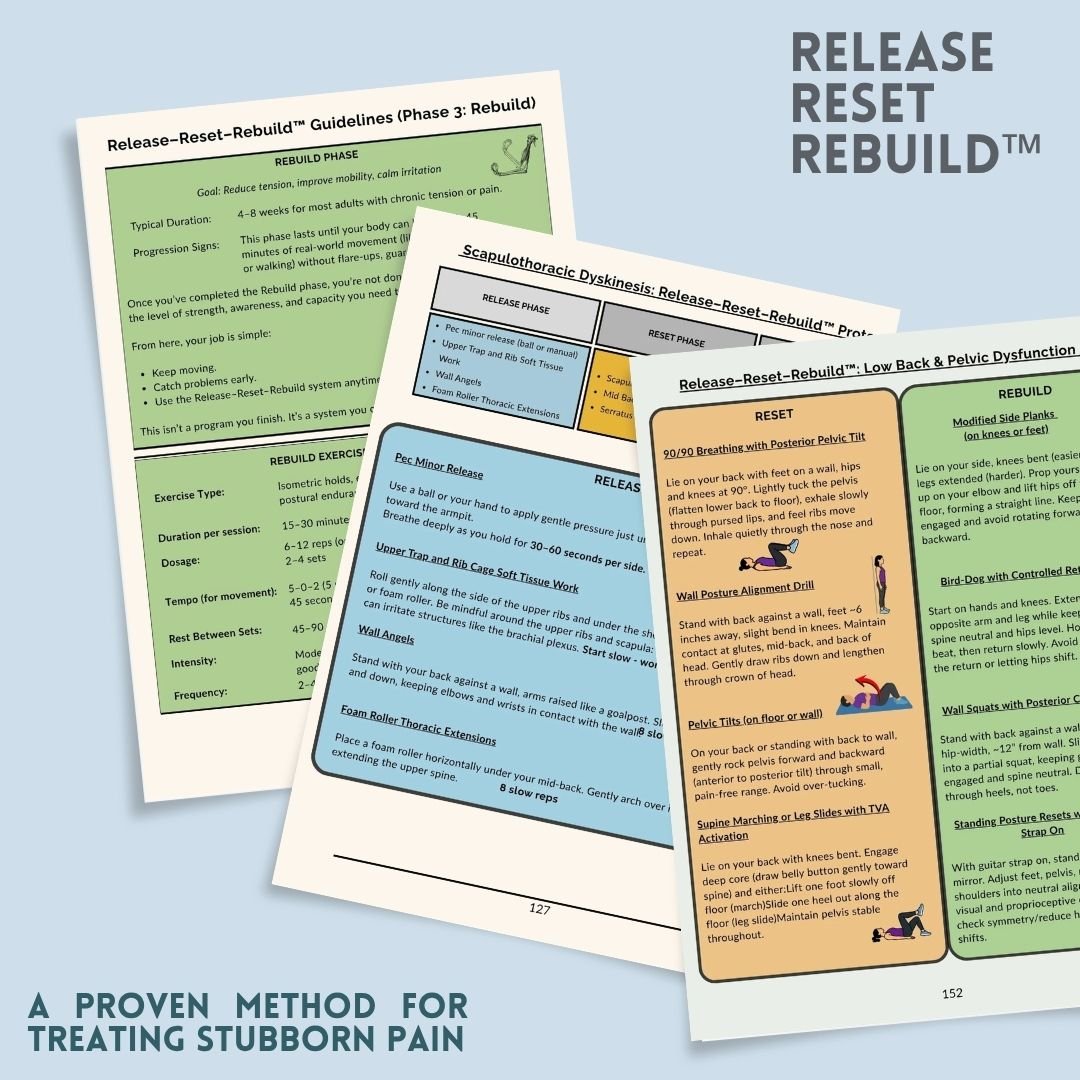 You’ll learn to assess your own pain, decode movement patterns, and apply the Release → Reset → Rebuild™ method to rebuild your body, your confidence, and your sound one page at a time.
