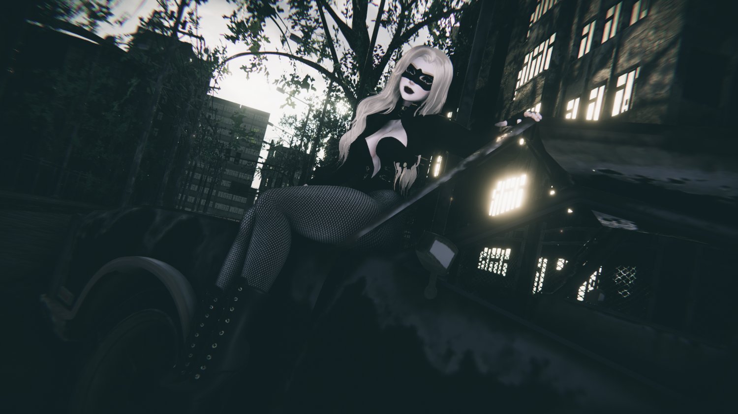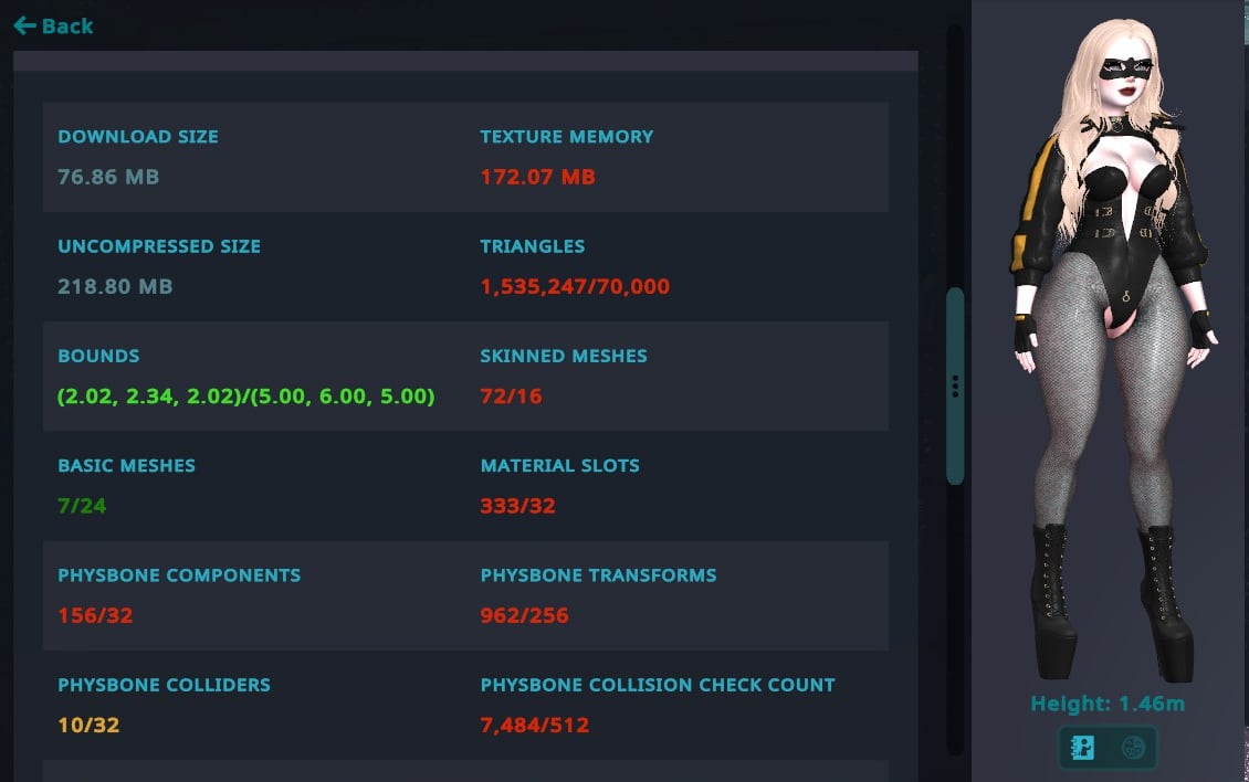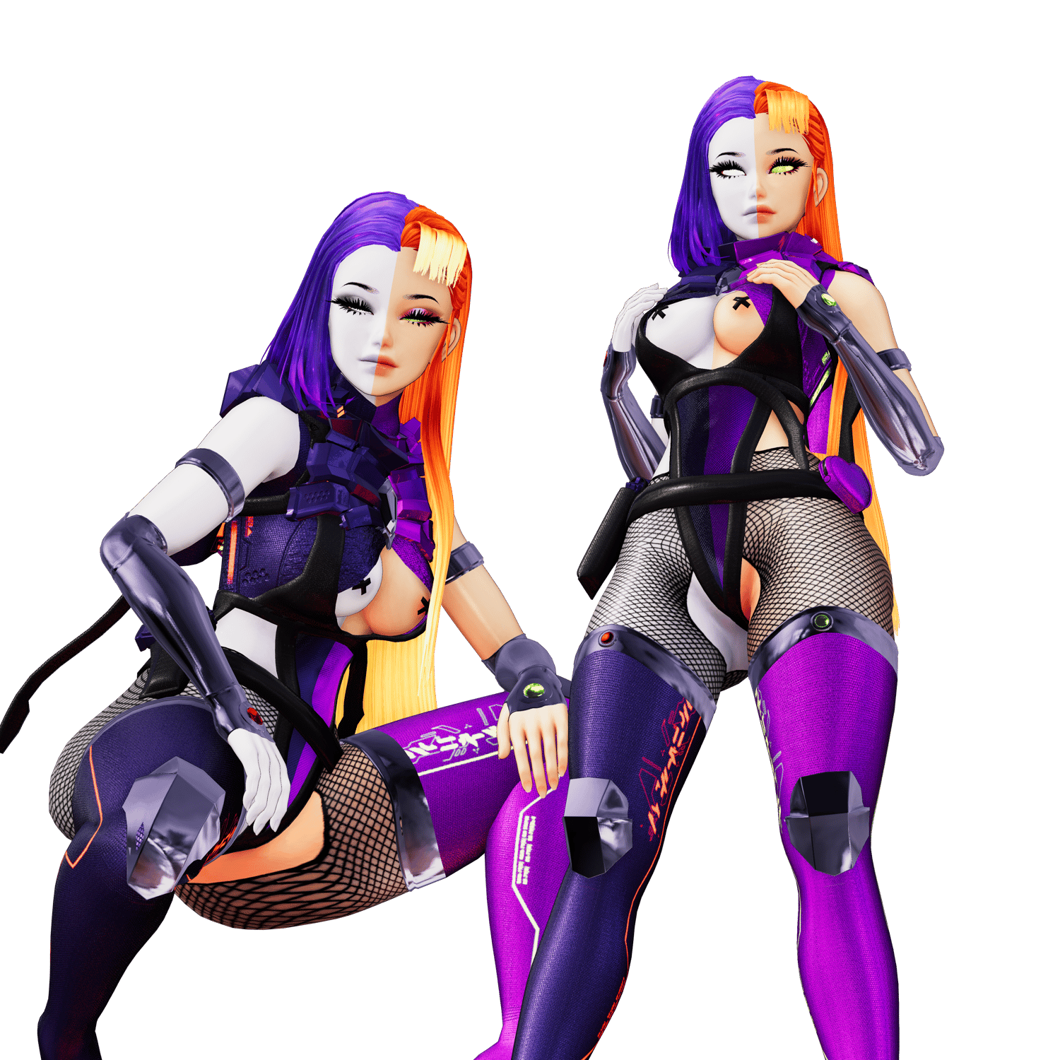 Body (edited by me)・ Head (edited by me)・ Seamless Head-Neck Merge (edited by me) ・ Lashes・ Eyeshadow (edited by me) ・ Blink Animation ・ VRCFury・ Eyes ・ Gogoloco ・ Hairs (edited by me) ・ Black Canary Jacket ・ Black Canary Suit ・ Raven Cyber Suit ・ Raven-Fire Suit ・ Cyber Boots ・ Corset ・ Shorts ・ Dress ・Gun ・ Heart Garter