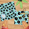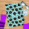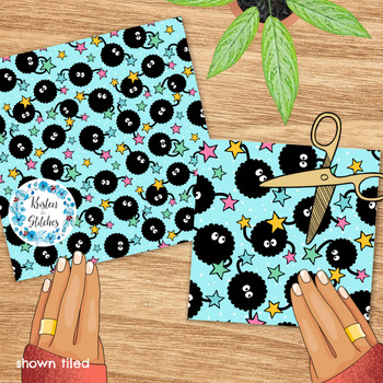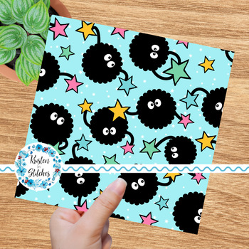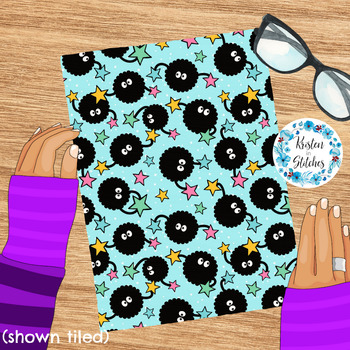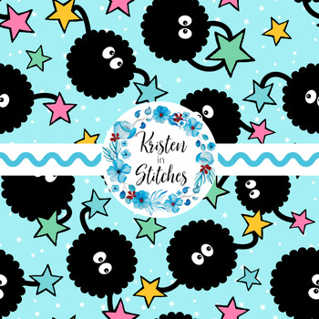 Cute Soot Sprites, or little black fuzz ball dust bunnies or Susuwatari. With Japanese Konpeito sugar stars in pastel colors on blue.