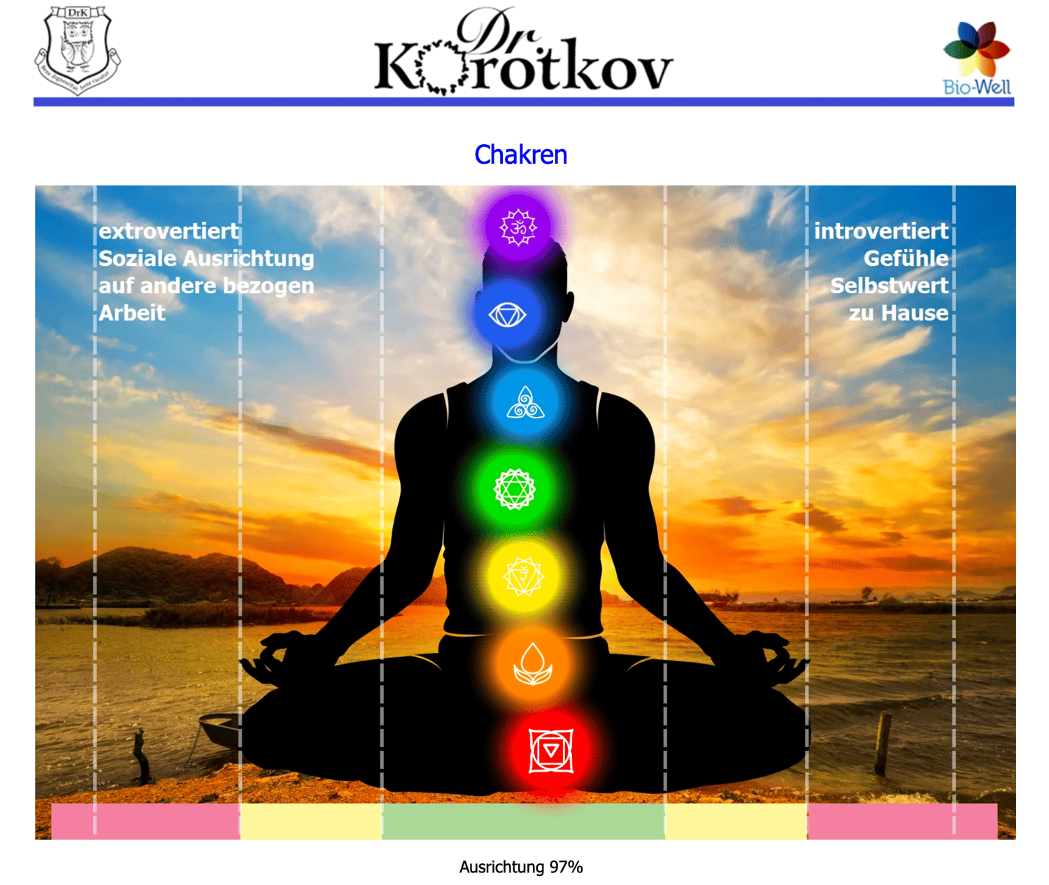 Hier siehst du ganz klar den Beweis, dass meine Methode zu 100% funktioniert. Hier wurden die Chakren mit Bio-Well gemessen. Meine Ausrichtung ist bei 97 %, ich bin zentriert. Und das durch das Abendritual und die Morgenroutine, nach meiner Affirmations-Methode.