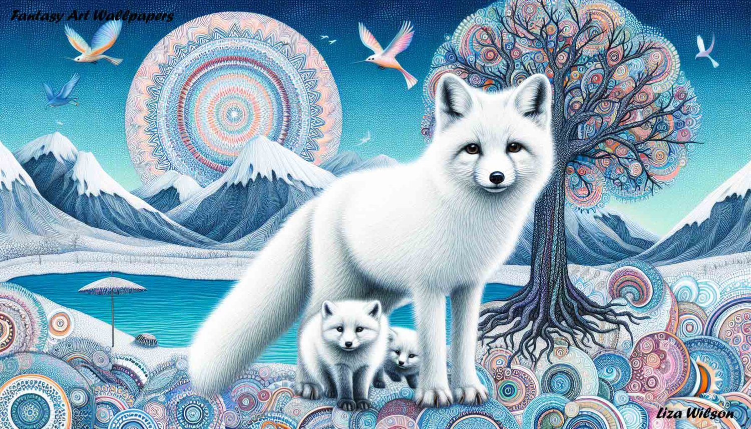 An Arctic Fox & cub beside a lake with patterned trees & mountains, colourful birds & flowers. Spirograph style.