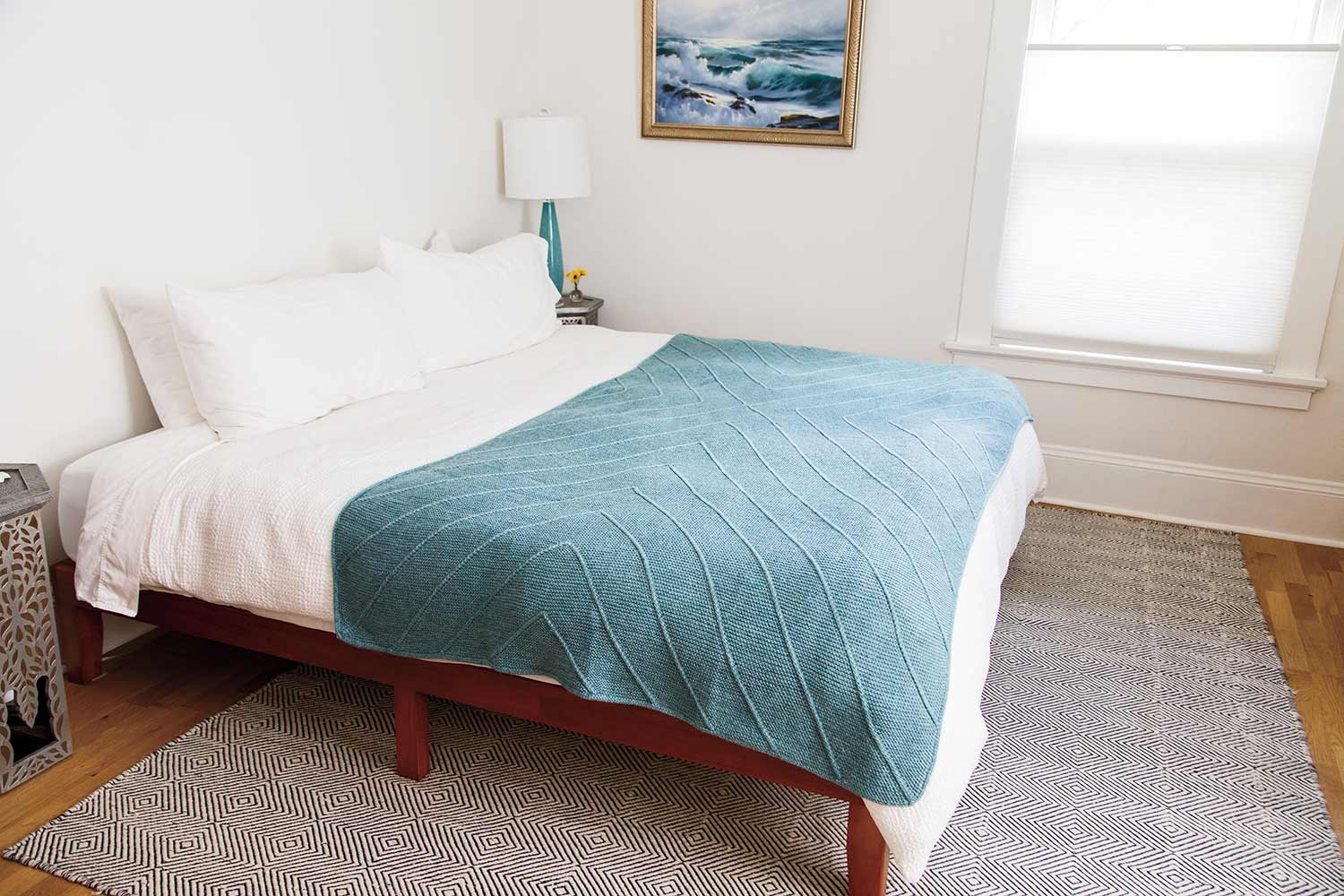 Modular joins become a design element in this textural, single-colour blanket. Diagonal lines play across the surface to create an interesting knit and visually pleasing graphic that looks great on both sides, making the blanket reversible.