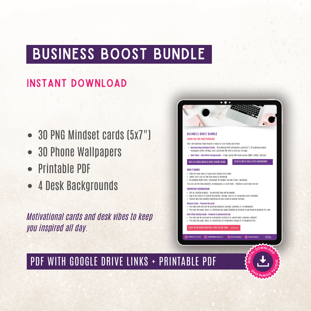 - Business Boost Bundle Links PDF – with clickable Google Drive links to download all PNG files.