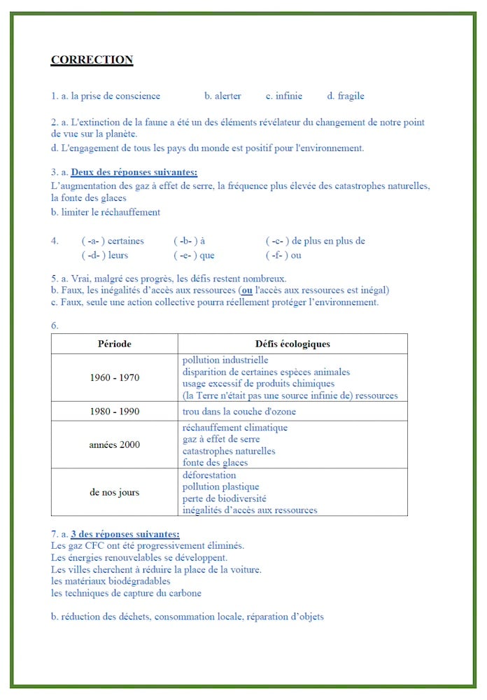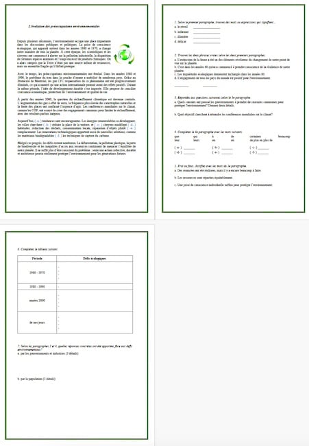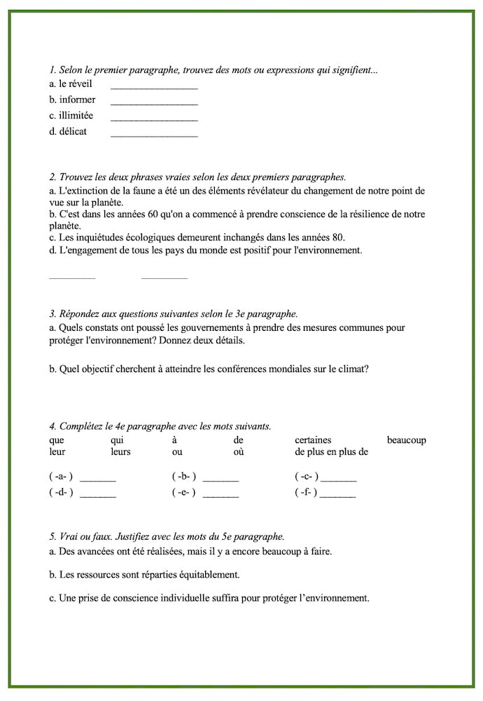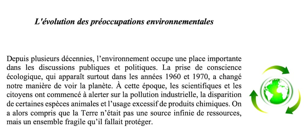 A reading exercise on the topic of sharing the planet: “L'évolution des préoccupations environnementales”.