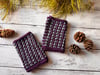 The design features Twice Sheared Sheep Everyday Merino (affiliate link) Worsted weight yarn in Plum (MC) and Dove (CC). 2 skeins of each color is needed to make the set.