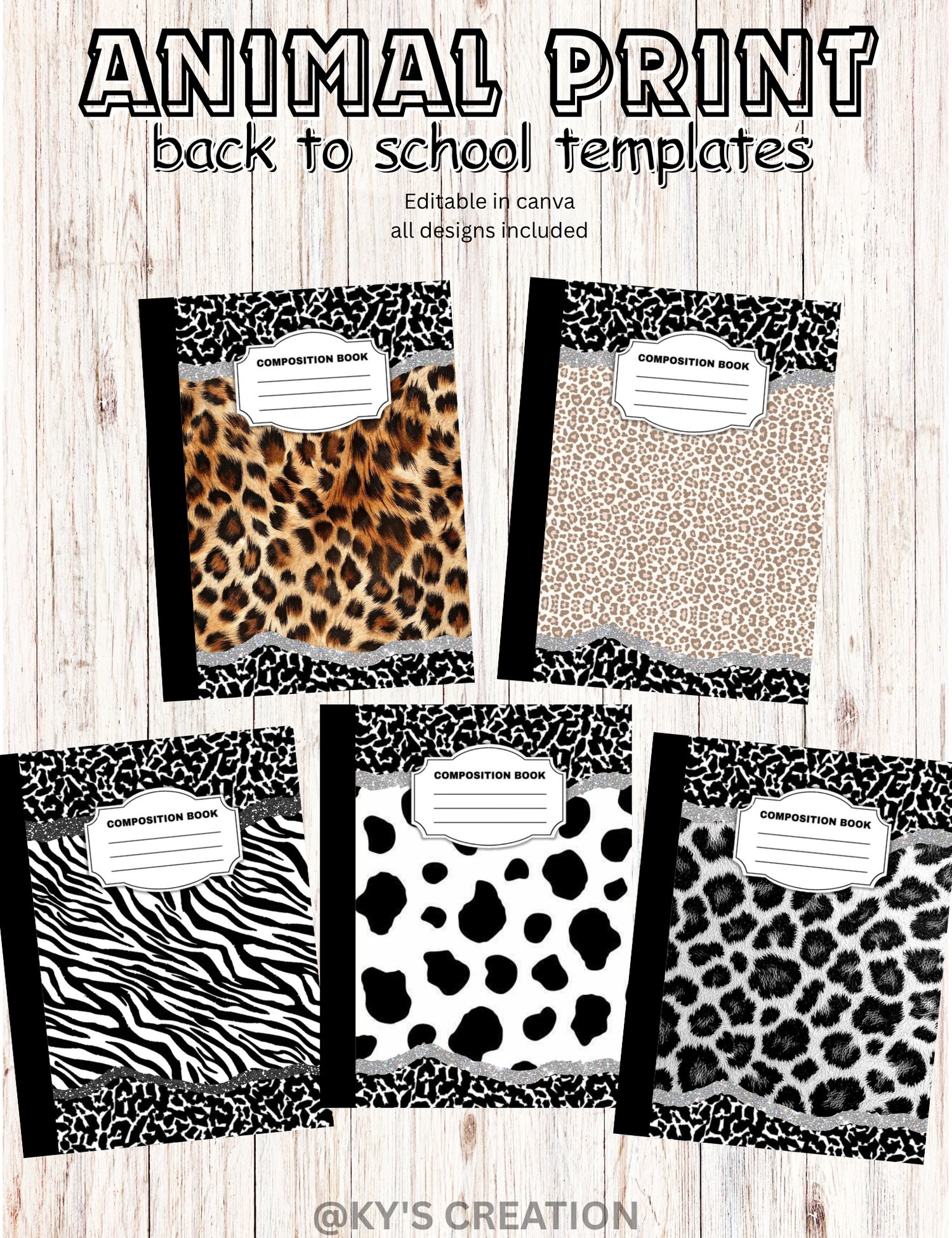 Bring wild style to your school supplies with this **Animal Print Composition Book Template Set**! Perfect for DIY lovers, teachers, students, and small shop owners, this digital bundle includes **10 bold and trendy animal print designs** that cover both the **front and back** of your composition books.