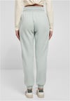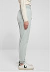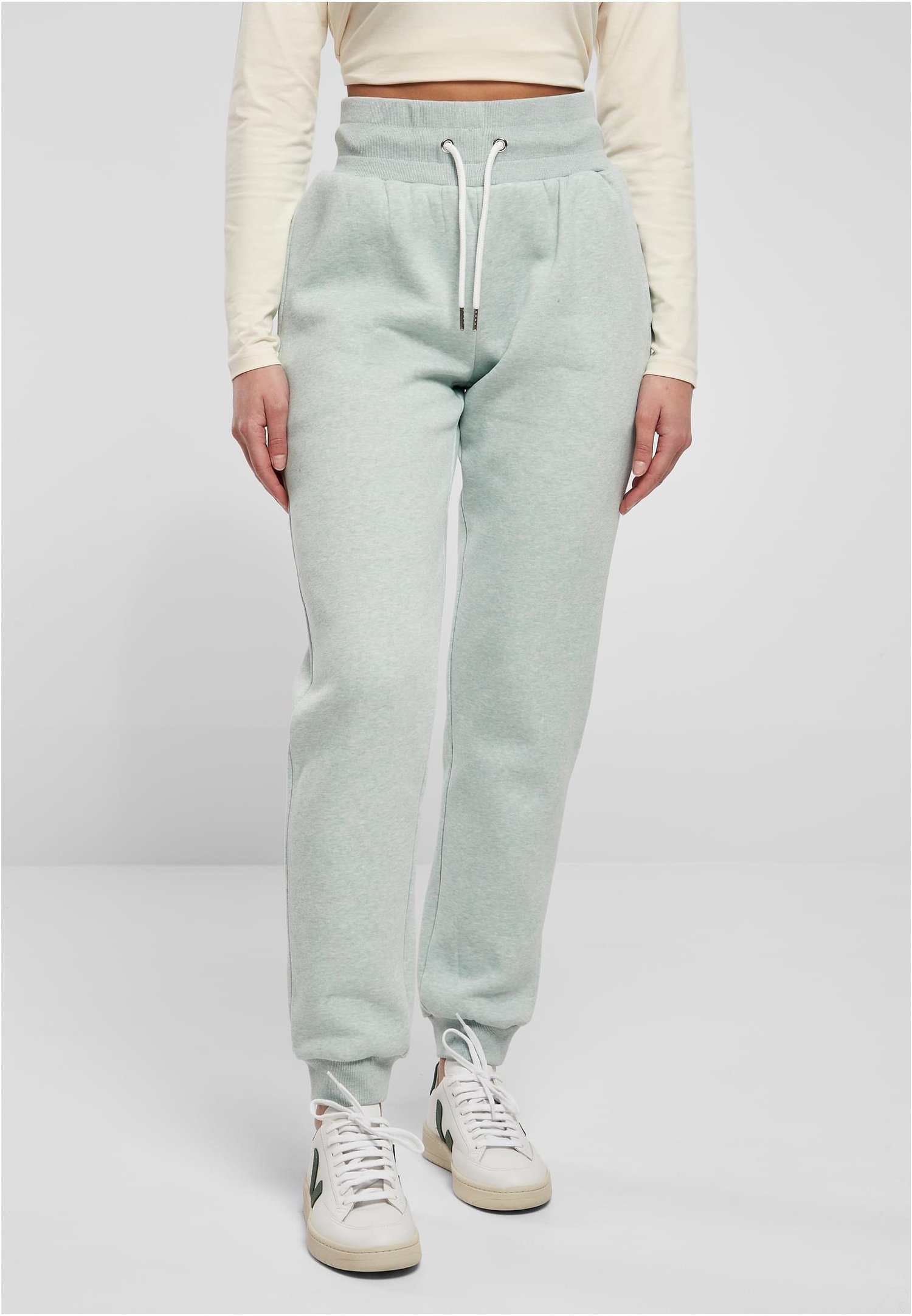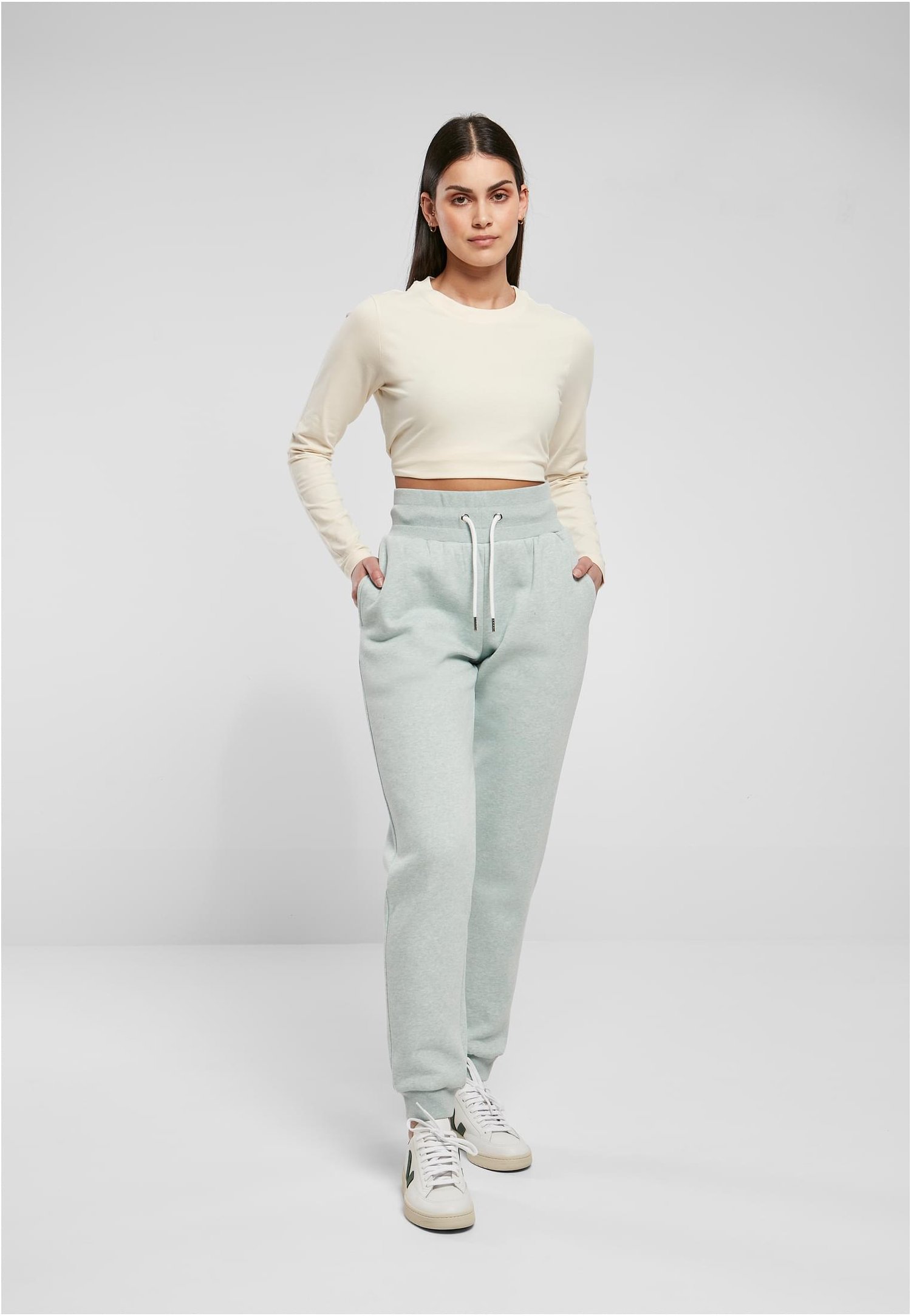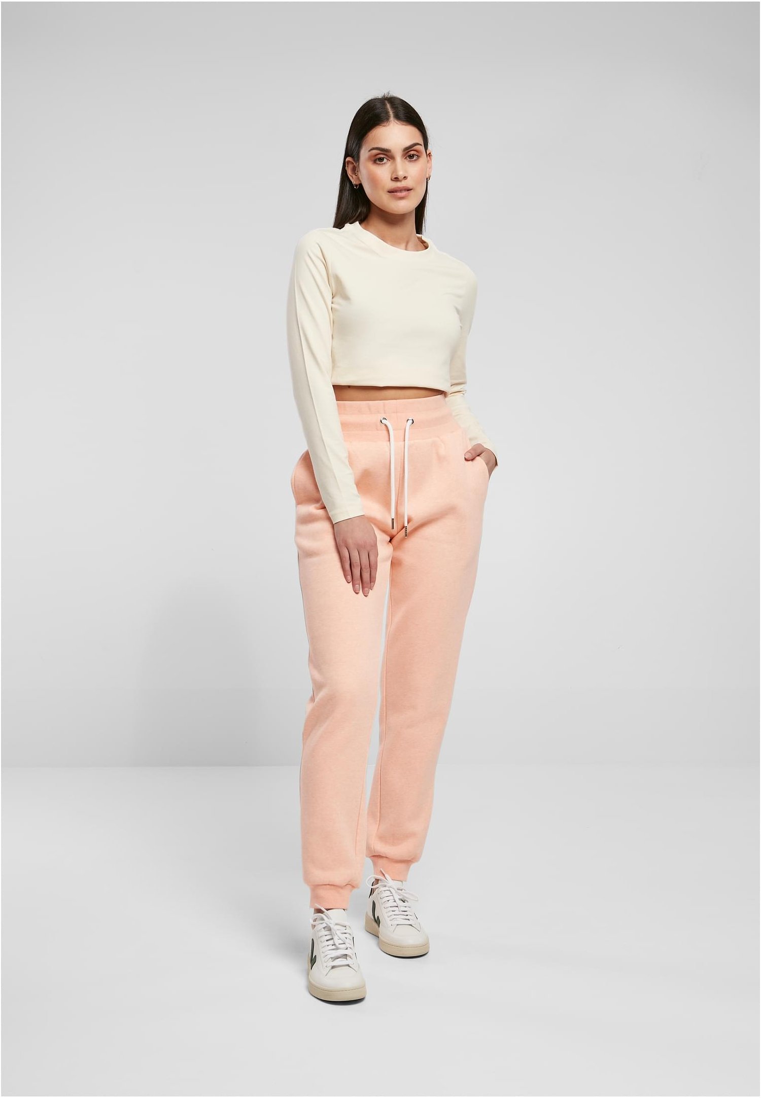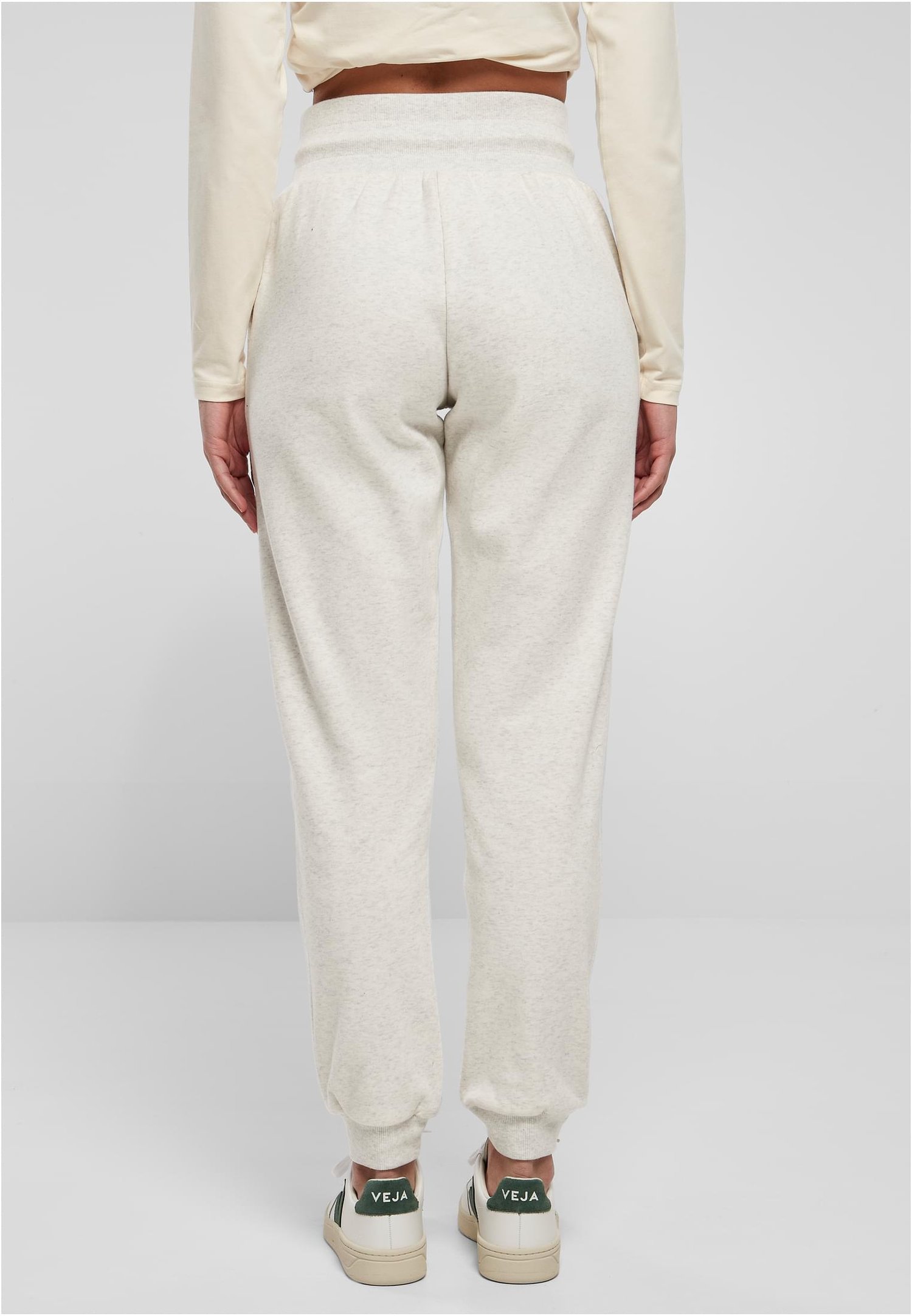 Women's sweatpants that satisfy with a sporty style in melange tones and are high wearing comfort. A special feature is the extra wide, high and elastic rib waistband with drawstrings. The ladies’ joggers are equipped with two side pockets and wide cuffs. They are made of a soft and smooth sweat wear fabric and are a regular fit.