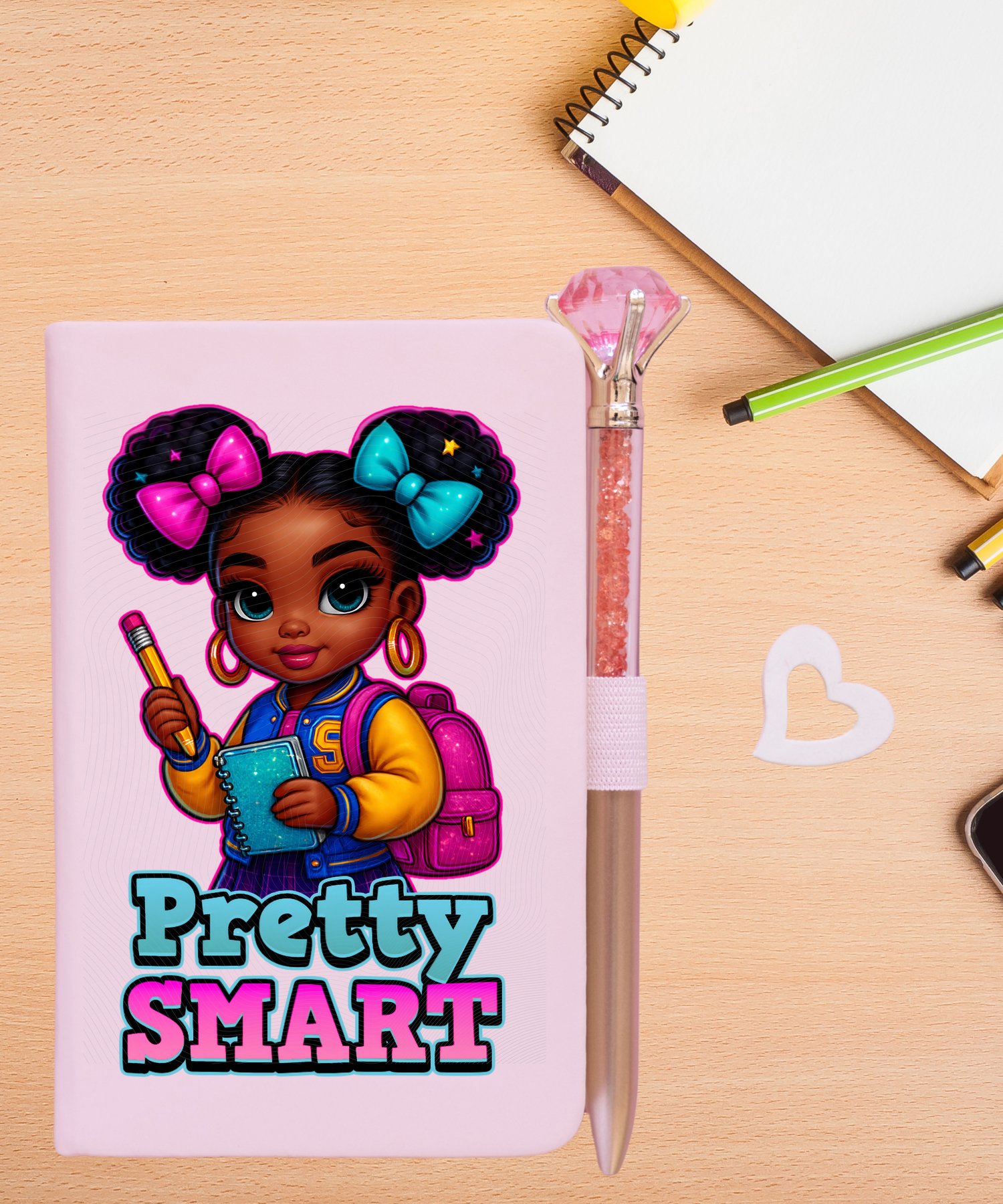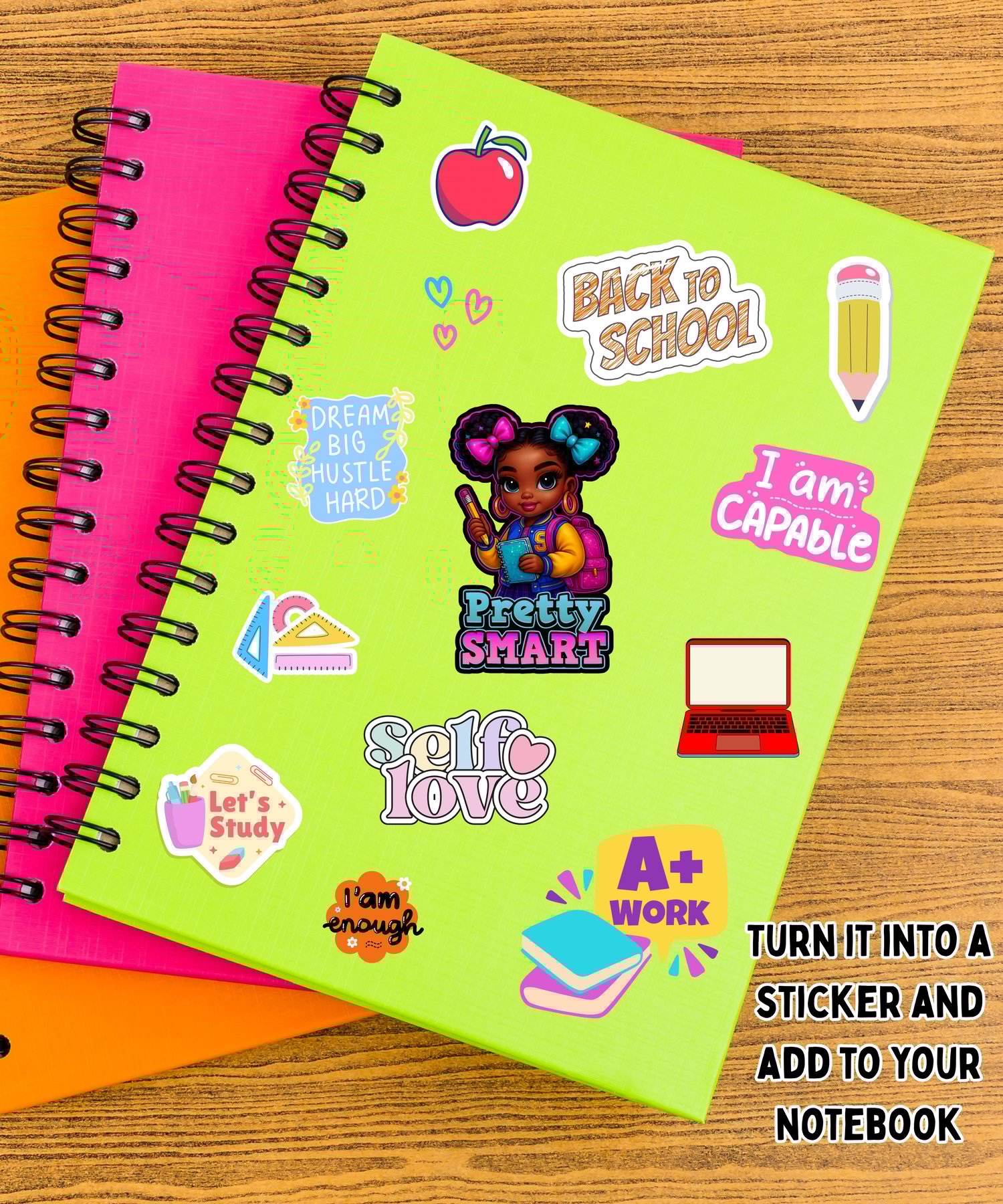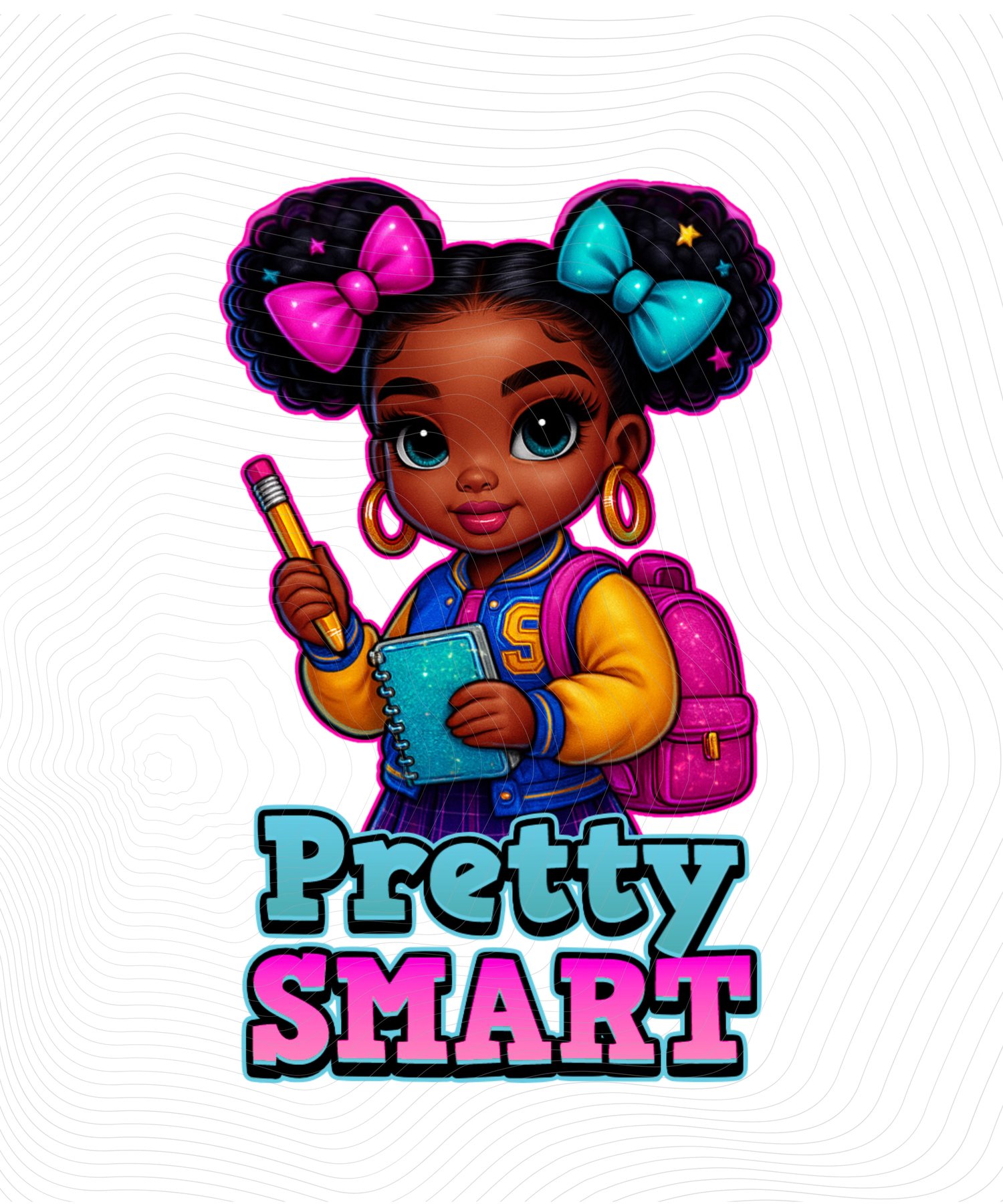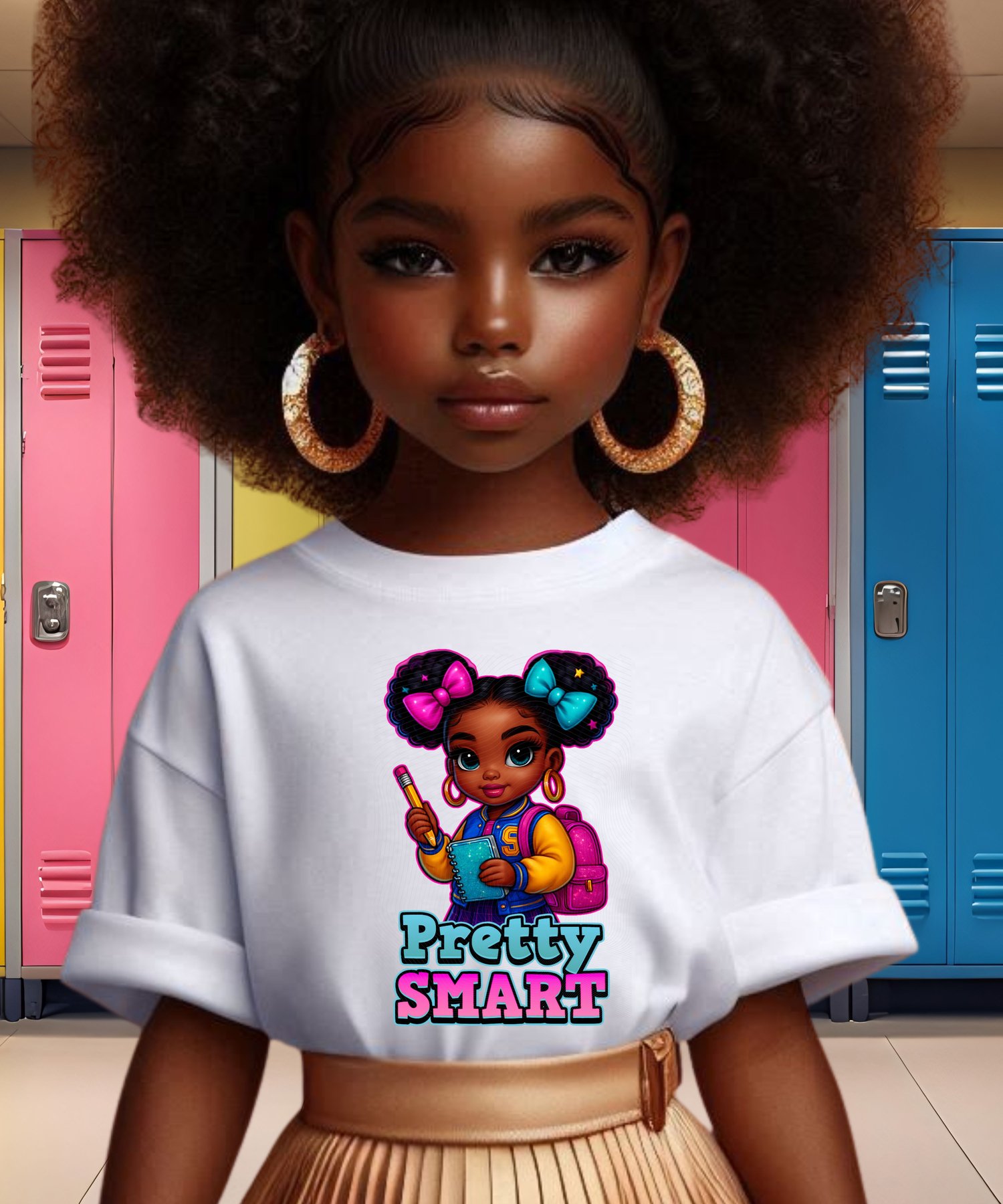 Because being pretty smart isn’t just a look — it’s a lifestyle. This “Pretty Smart” design features a confident cartoon Black girl with stylish puffs, pastel bows, a glitter notebook, and varsity vibes. Perfect for back-to-school t-shirts, folders, and personalized accessories, it’s made to empower and inspire.
