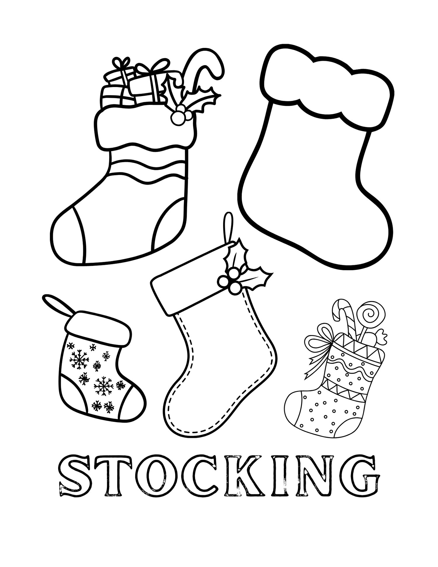 stocking coloring page, christmas printable, holiday coloring page, winter craft printable, kids coloring sheet, still earth studio