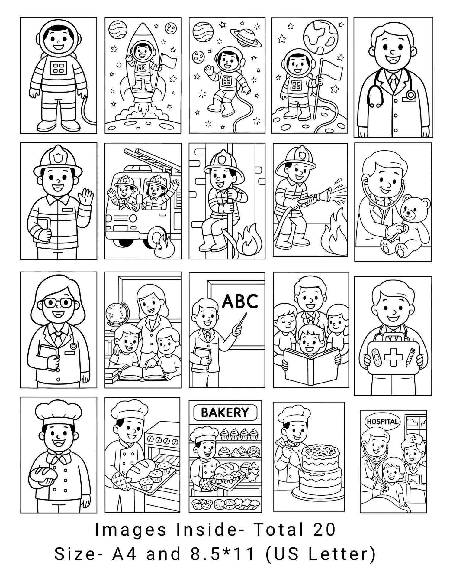 - 20 unique coloring pages (doctor, teacher, firefighter, baker, astronaut).