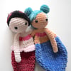 The Mermaid Ragdoll Lovey is a cuddly toy that has a flat body, mimicking a security blanket for babies, toddlers, and young children. This low-sew amigurumi project requires only sewing for the hair; the head and body parts are all crocheted in one piece making it almost no-sew. This pattern includes two different styles for the body, including a narrower mermaid tail (doll version) and a wider fish tail (blanket version). The hair can also be easily customized to include one hair bun or two buns. There are also instructions to add optional accessories, like hair bands and sea flowers.