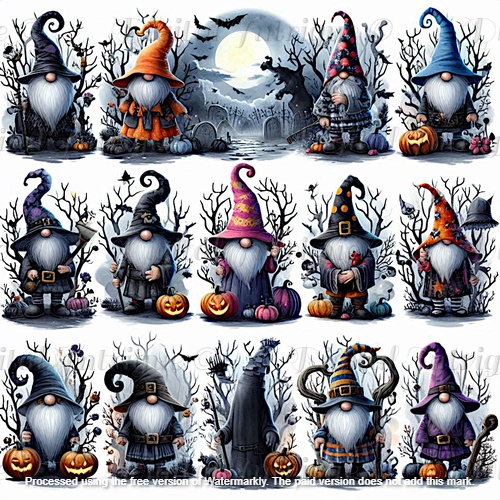 Keywords: Halloween gnomes, spooky clipart, whimsical illustrations, fall decor, printable art, digital download, witch gnome, pumpkin gnome, Halloween bundle, seasonal graphics, cute Halloween, autumn gnomes, fantasy art, magical creatures