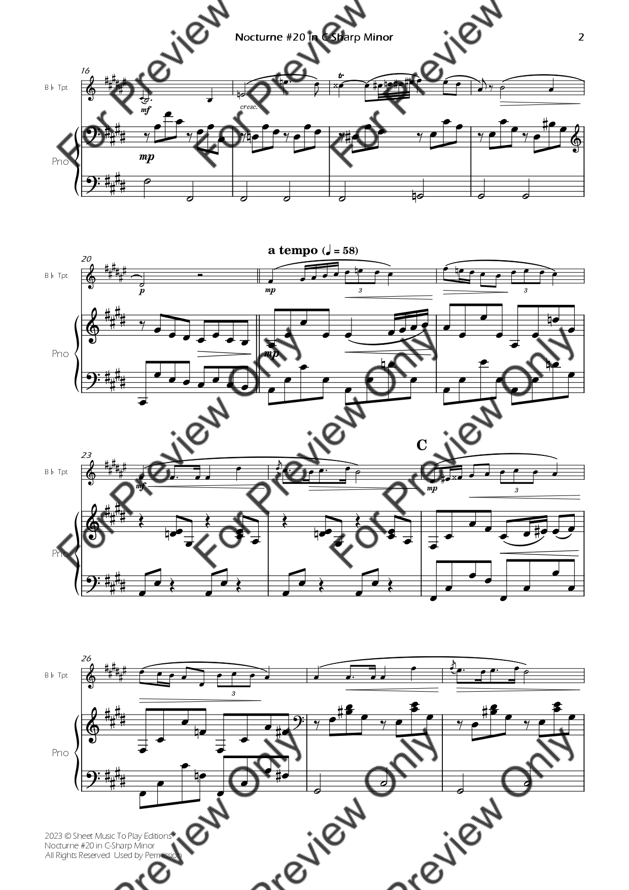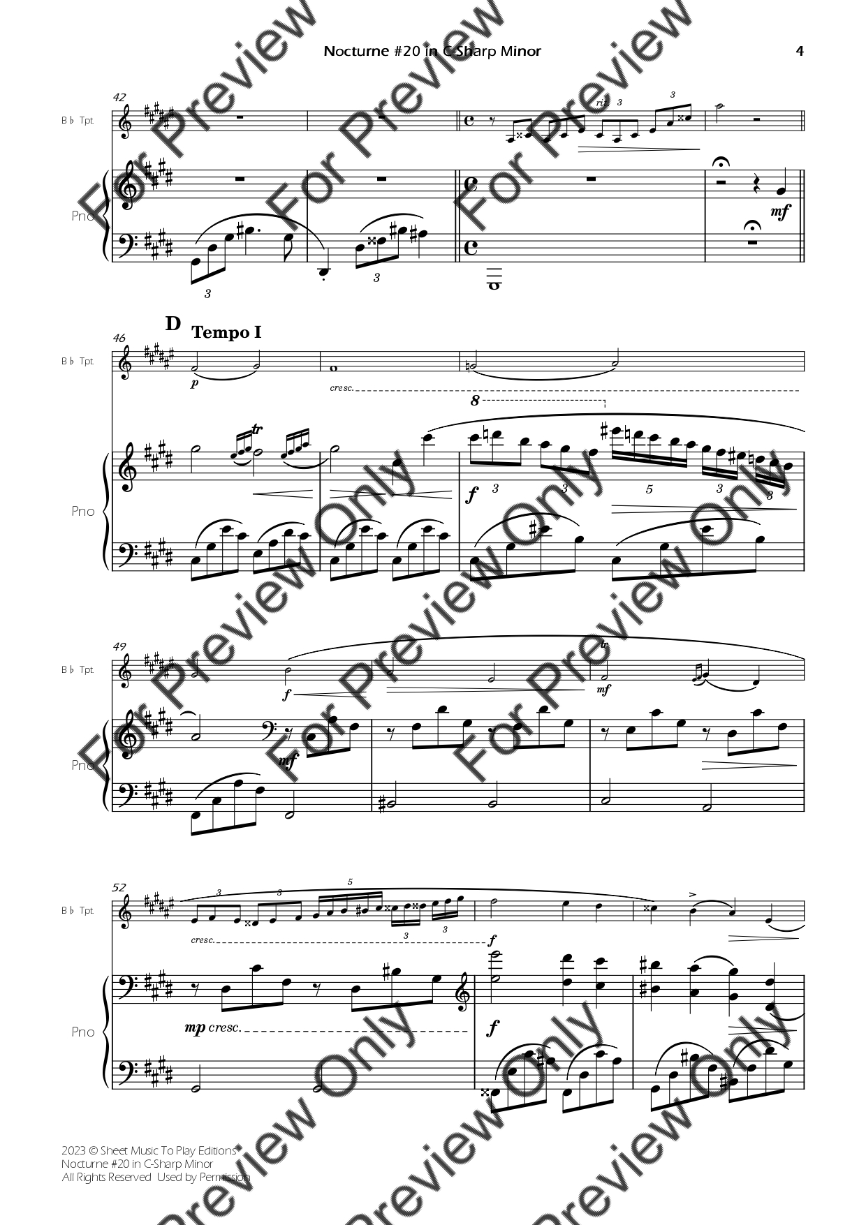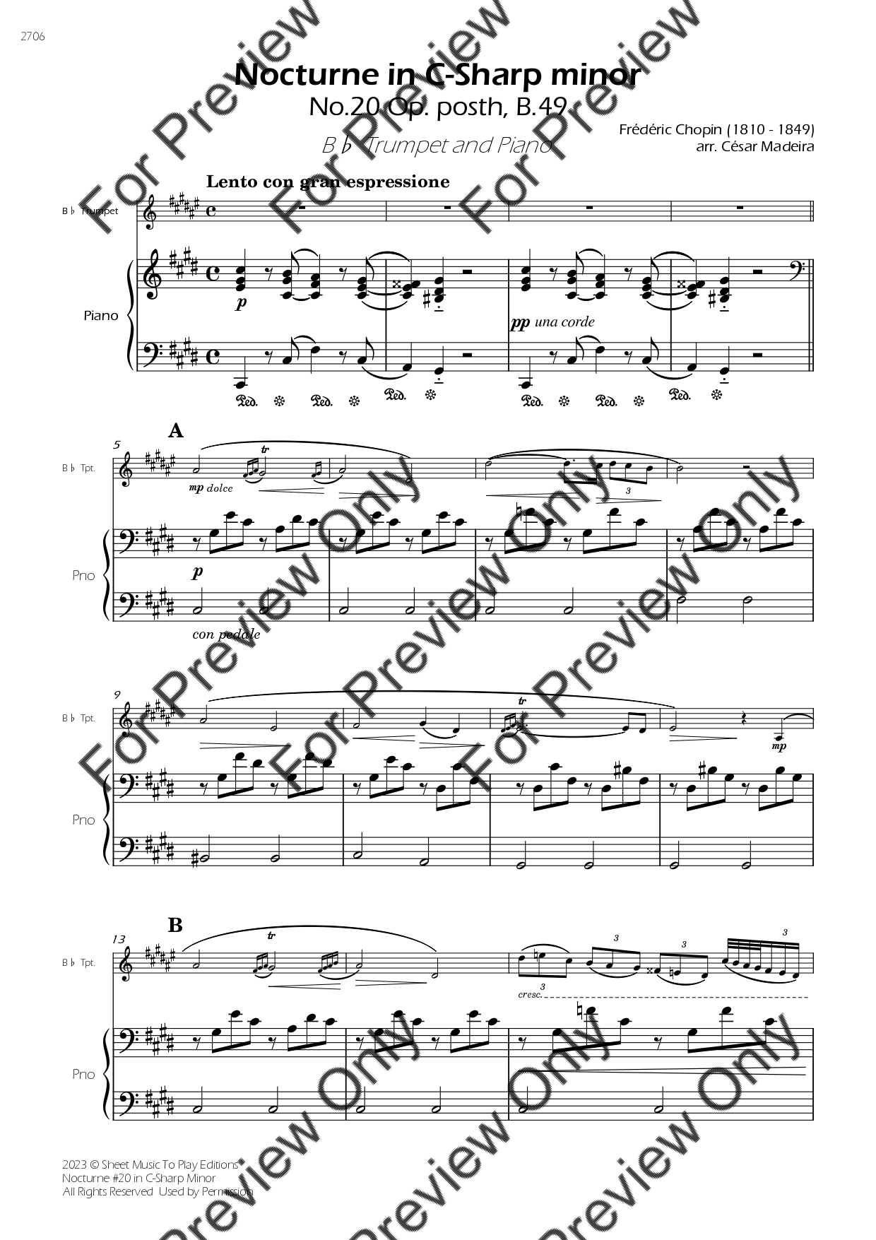 Nocturne No.20 in C-Sharp minor by Frederic Chopin. Arrangement for Bb Trumpet and Piano. With Full Score and Individual Parts. Have fun!