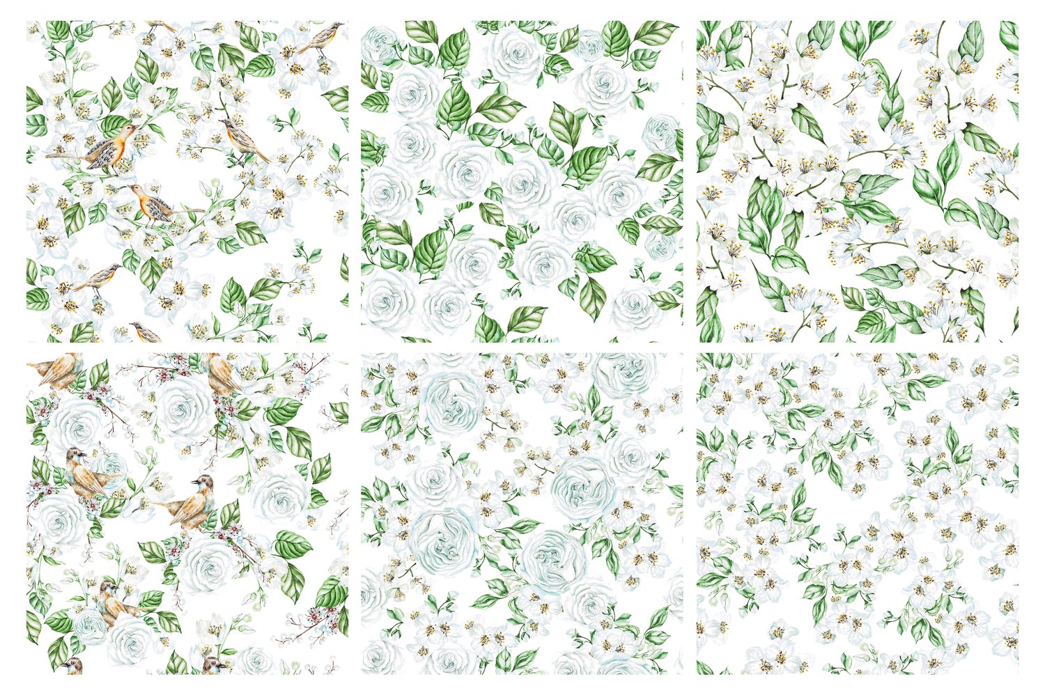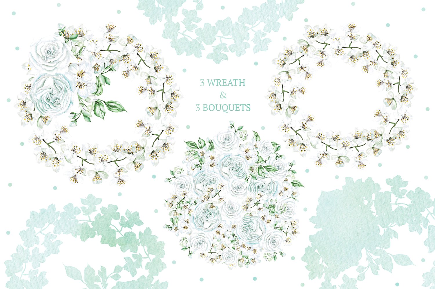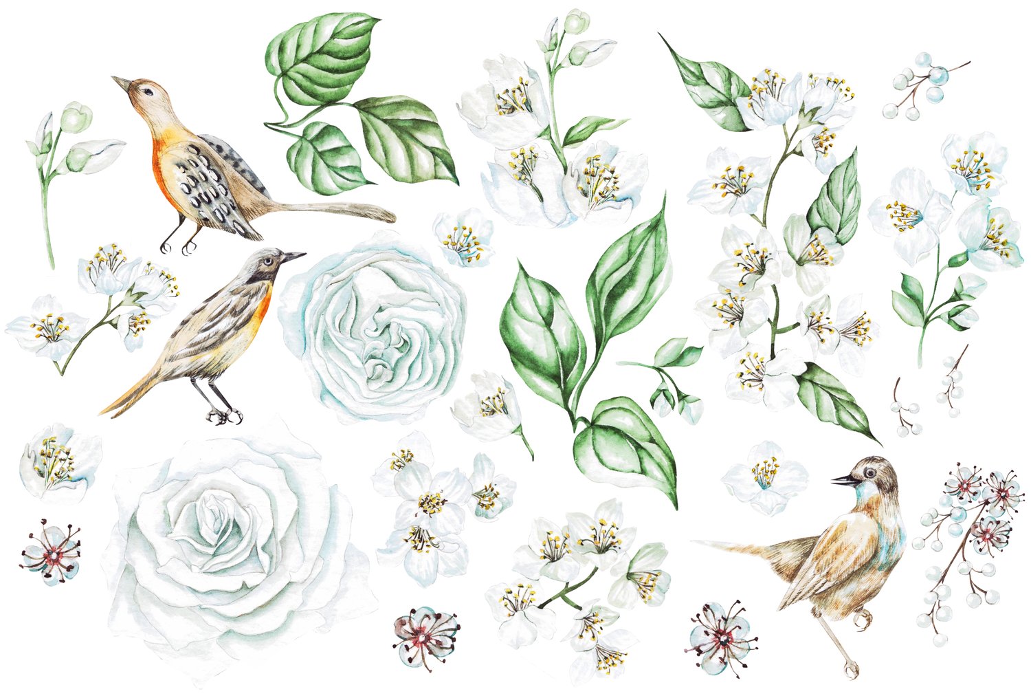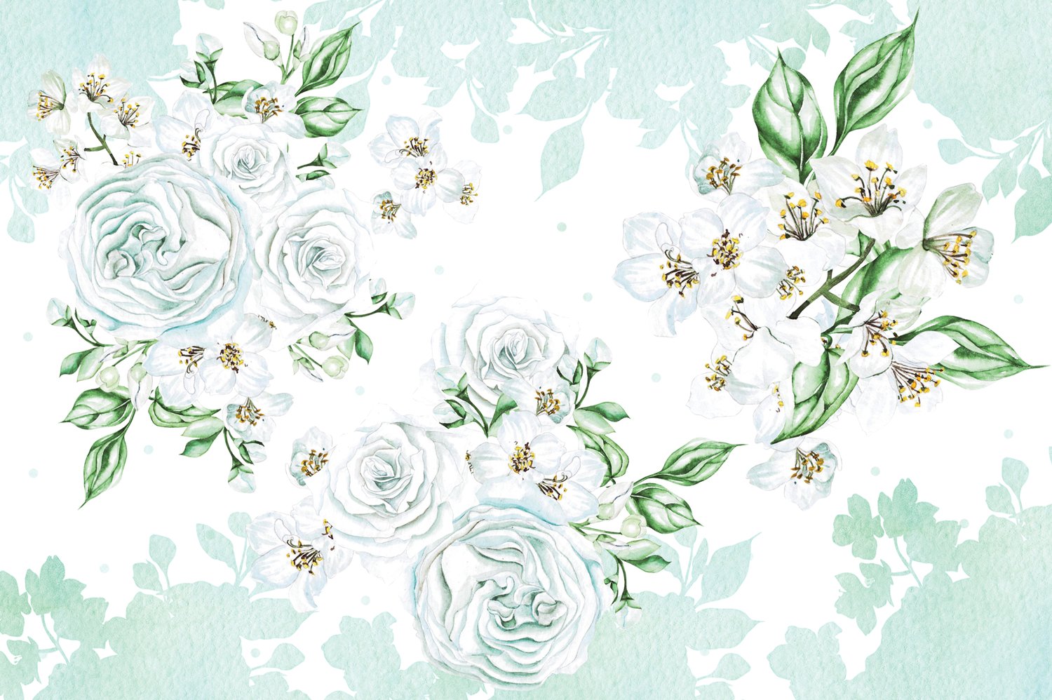 This watercolor set consists of 42 watercolor elements. They include patterns, bouquets, wreaths and elements separately. Delicate watercolor roses and jasmine flowers, leaves and buds.