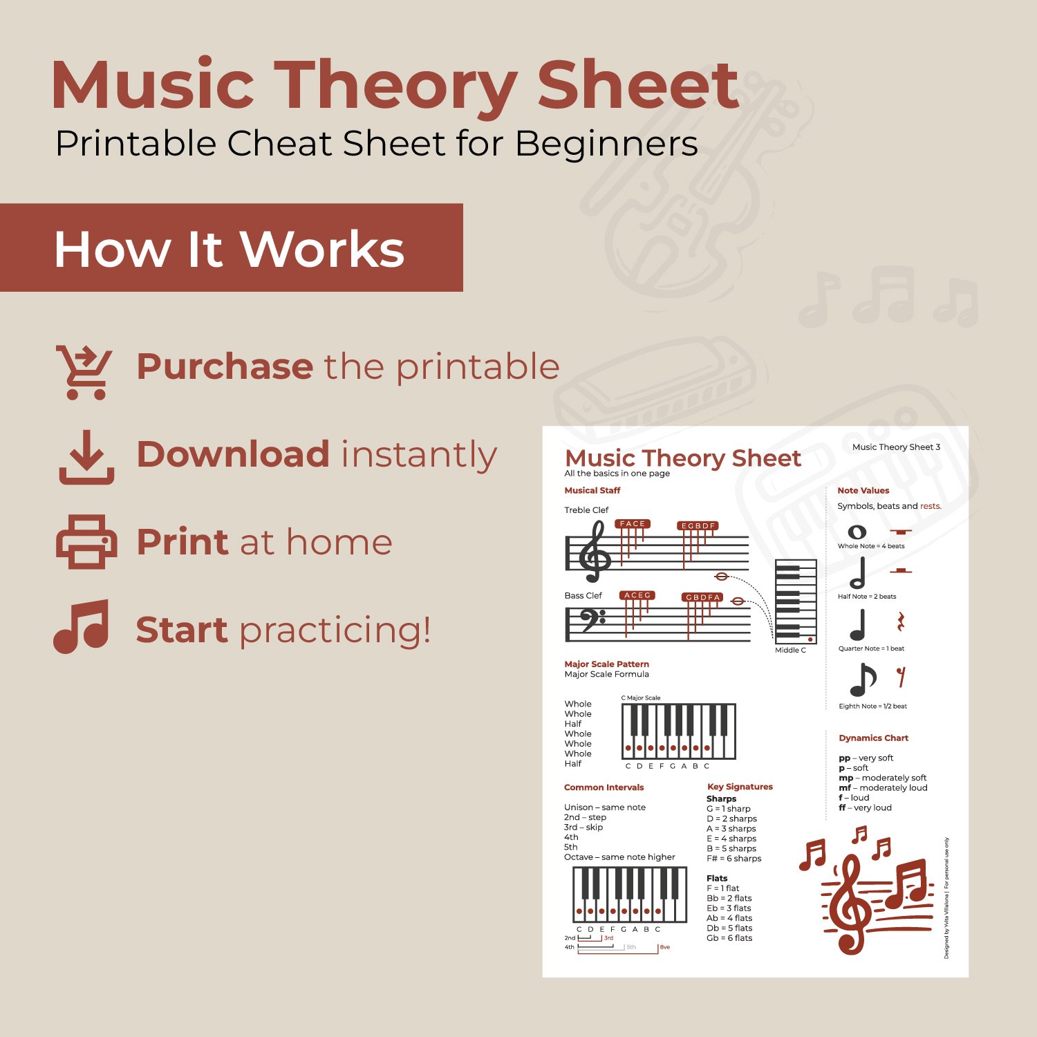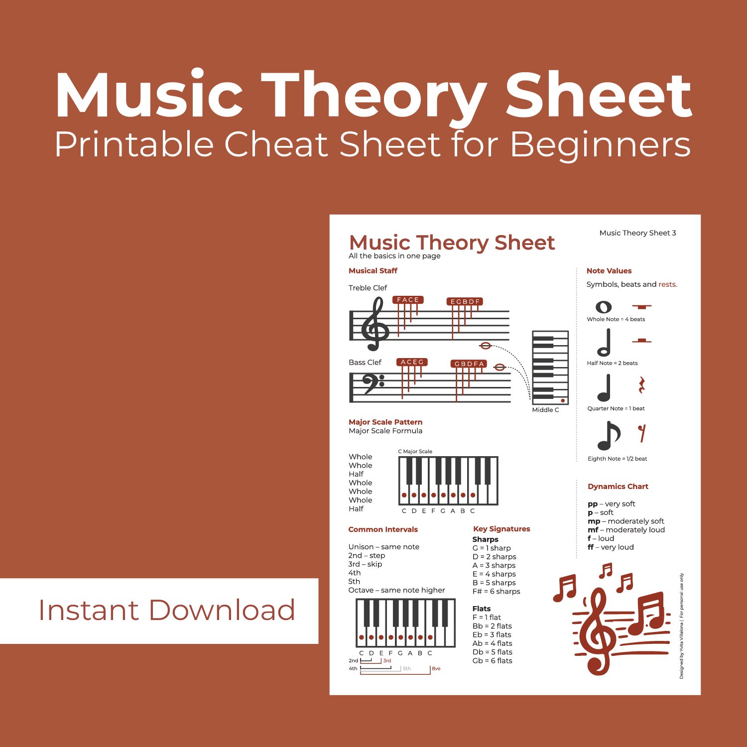 Music Theory Cheat Sheet – Printable Music Theory Reference | Staff Notes, Rhythm & Scales Guide | Beginner Music Theory Chart | Instant Download