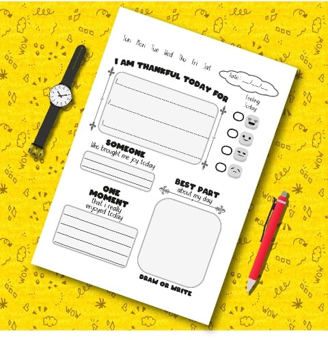 Daily Gratitude: Practicing gratitude daily will increase happiness, improve self-esteem, and lower levels of stress in your kids. Through writing and drawing, children will learn to give daily thanks for the good in their lives.